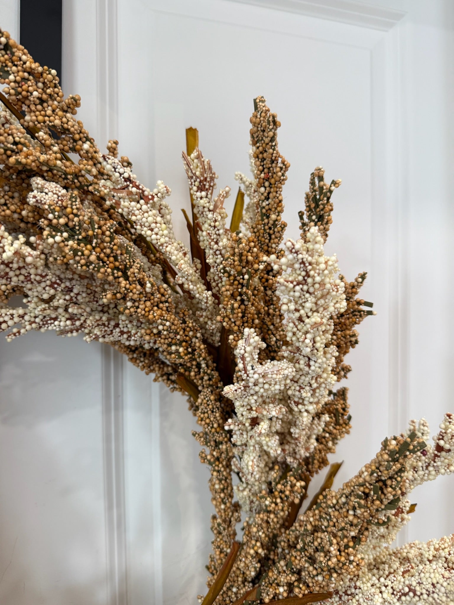 Our 22" Cream & Brown Heather Wreath features dried seed clusters in neutral tones in a beautiful, yet simplistic design that works perfect from fall through the holiday season.