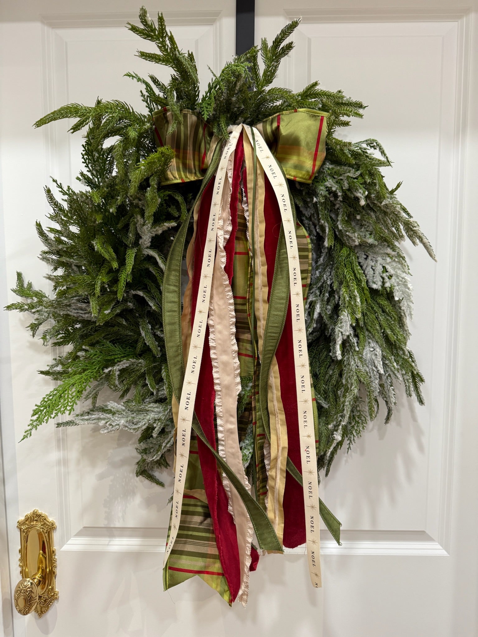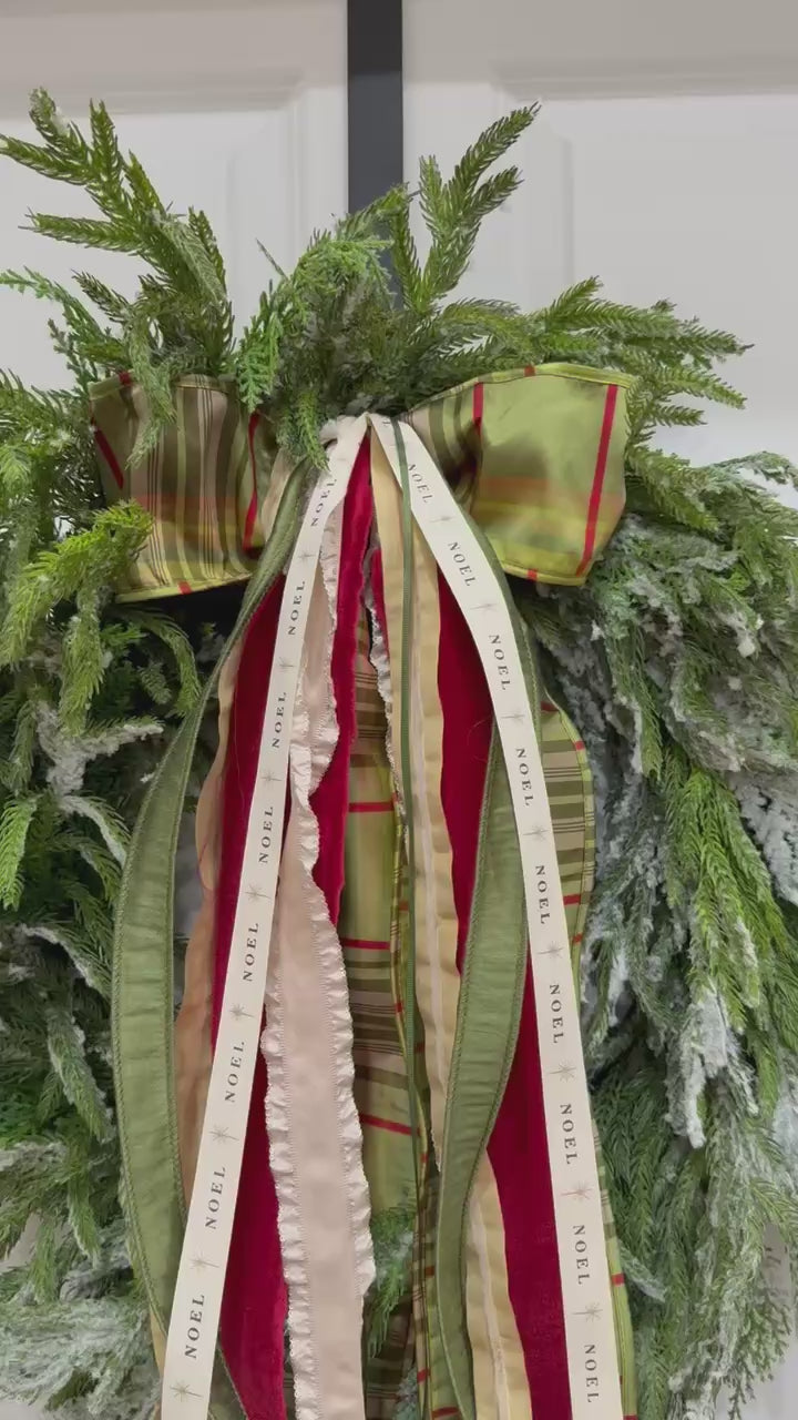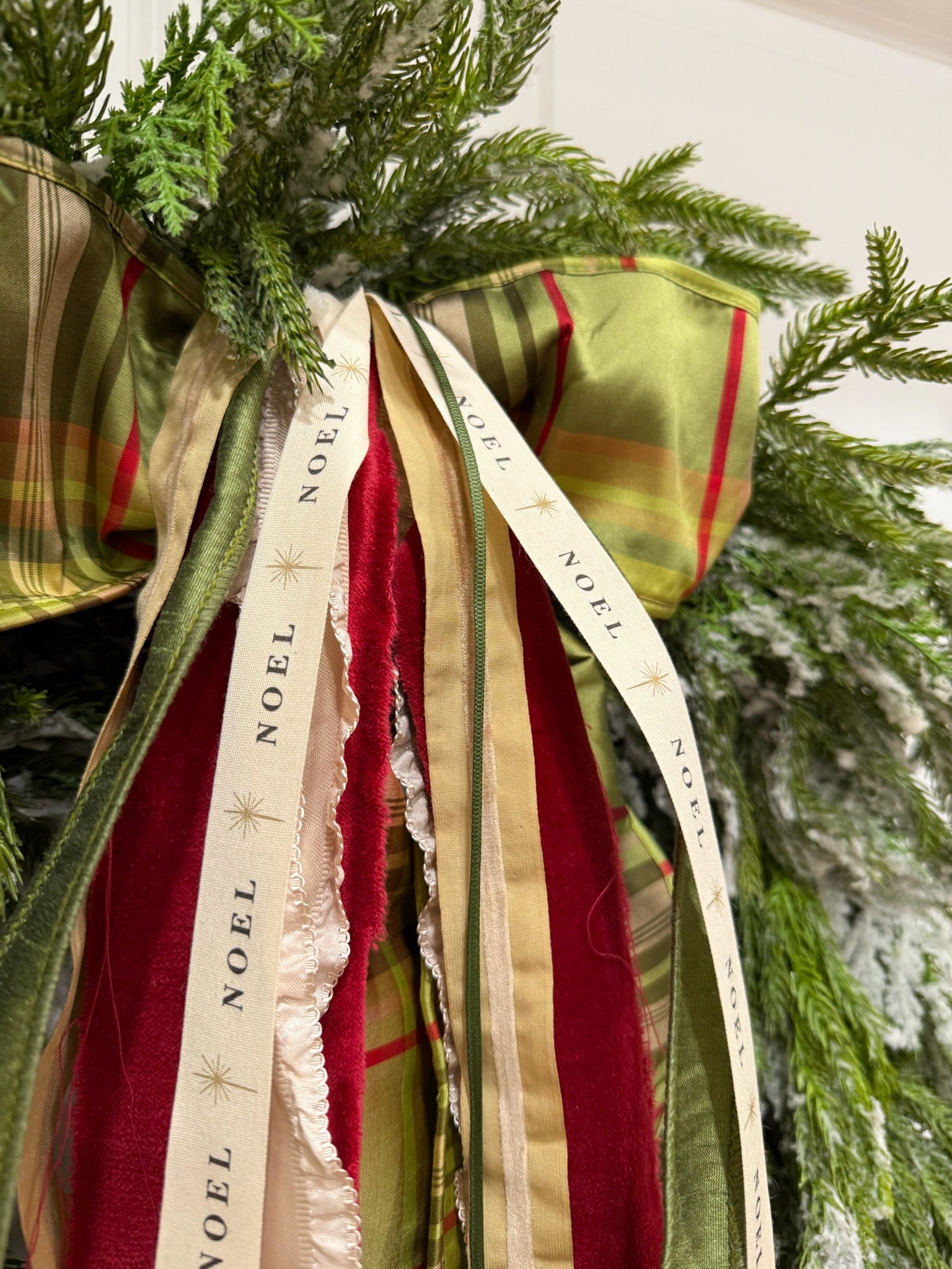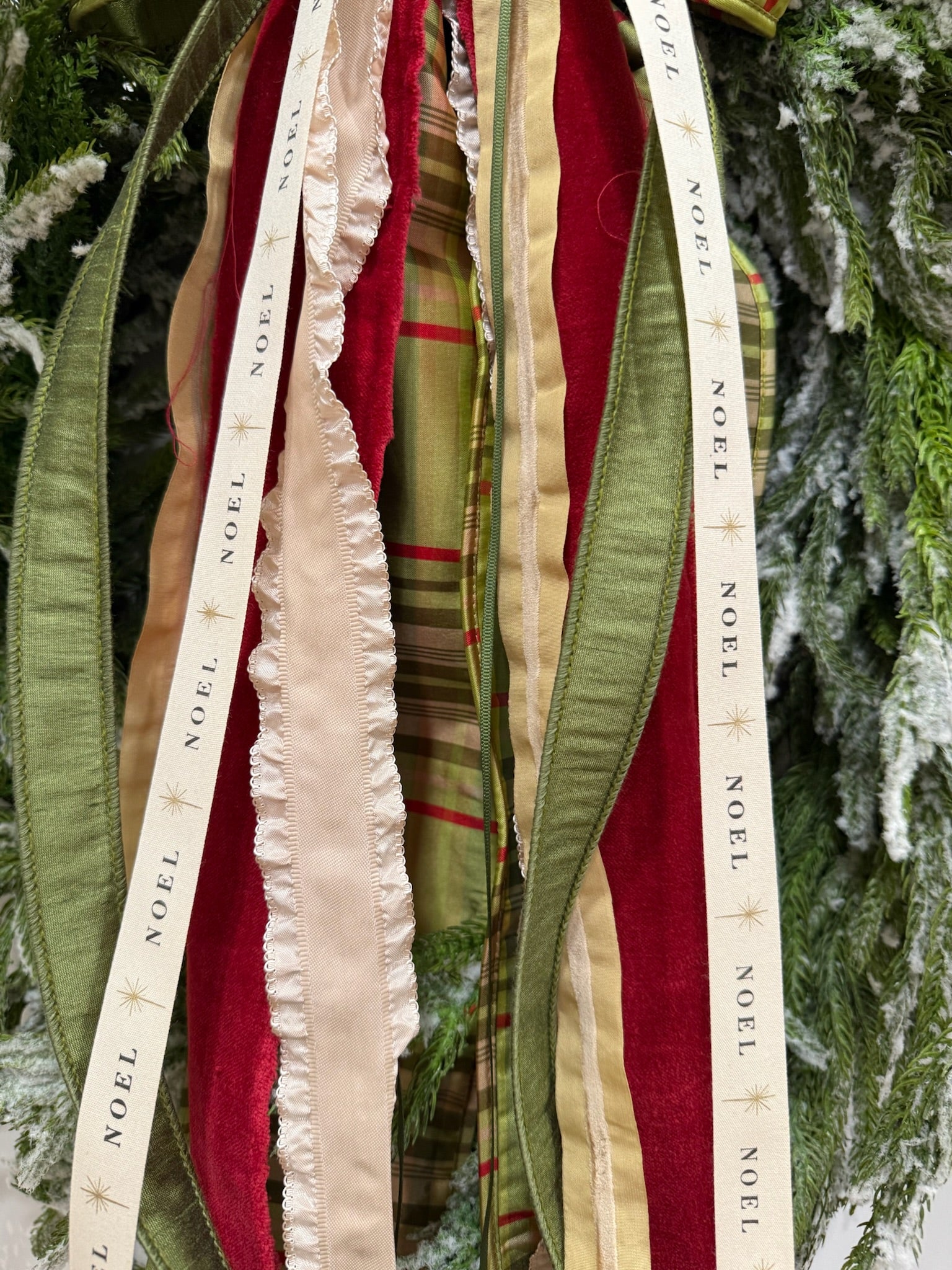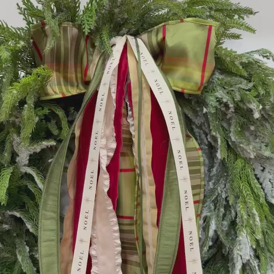 Chartreuse Cheer features an incredible 4” holiday tartan plaid with chartreuse green background, cream double-ruffle satin, red frayed-edge velvet, green wired-edge satin, taupe with velvet stripe, and Noel print with subtle star. A classic Christmas set indeed.