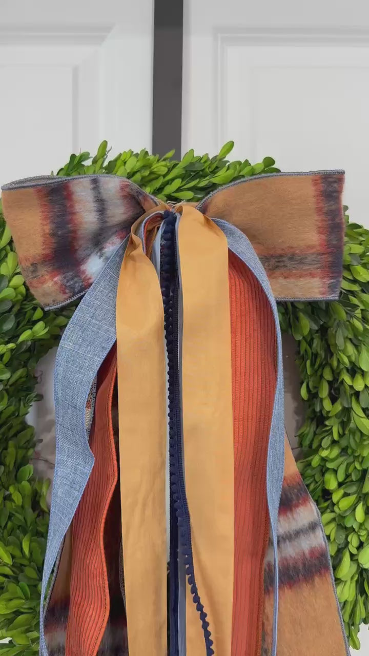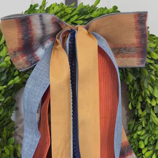 Harvest Plaid & Textures strikes the ideal balance of cozy and refined. The woven plaid bow showcases a timeless fall color palette, while the coordinating ribbons highlight each shade within the plaid including a few extra fall tones such as golden yellow, rich blues, warm rust, soft beige, copper and deep mustard.