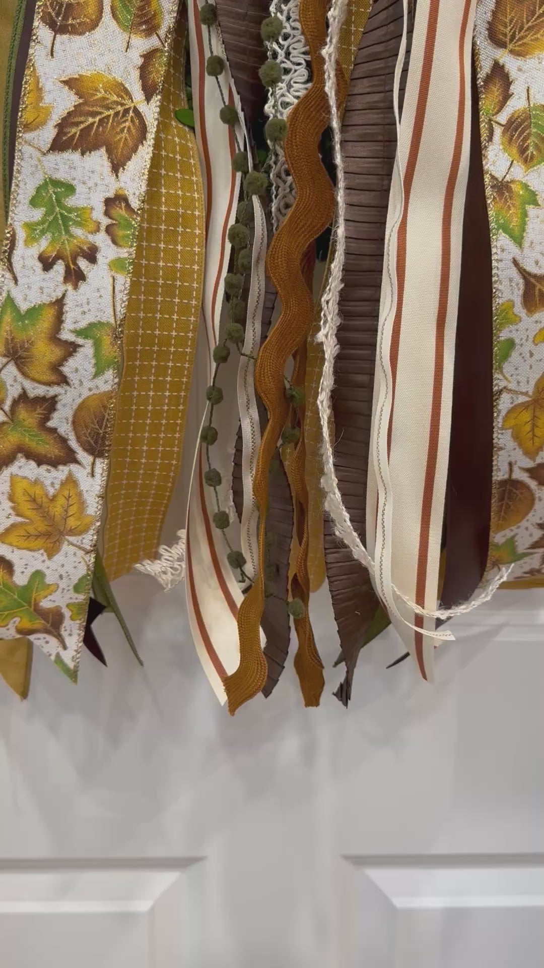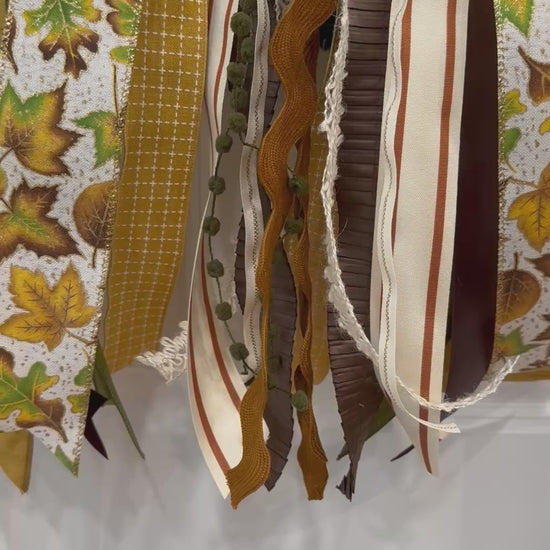 A rich gold taffeta bow sets the stage for this Golden Orchard ribbon set. Flowing below are layers of cream and green stripes, leaf-printed ribbon with green, yellow and brown leaves and a copper-and-cream stripe that ties the palette together. A copper rickrack adds a playful moment, while delicate cream lace softens the look. Green poms and lush green velvet brings depth and texture, creating a bundle that feels both elegant and festive. Designed to pop against a green wreath, it's striking touch of fall charm.