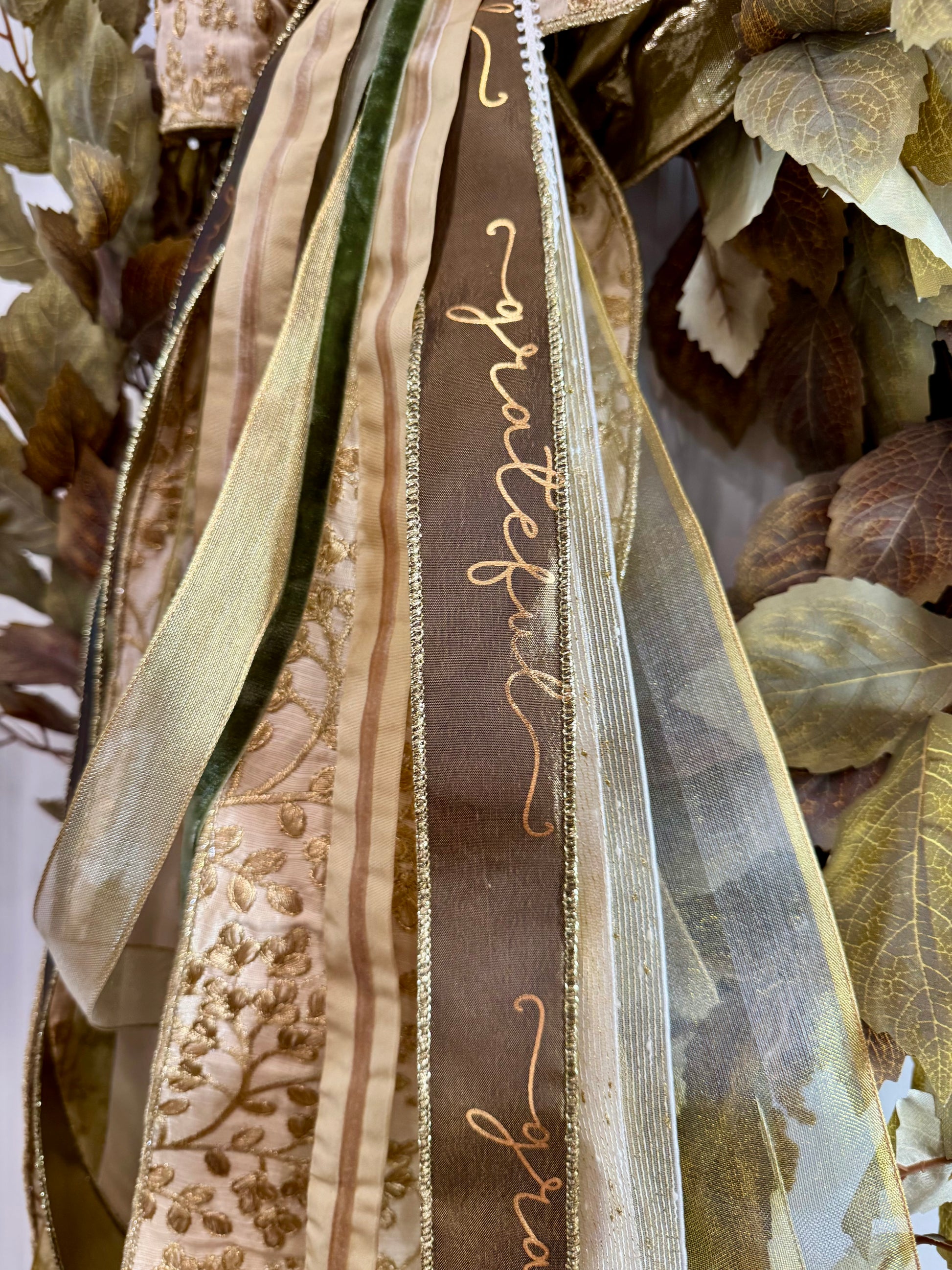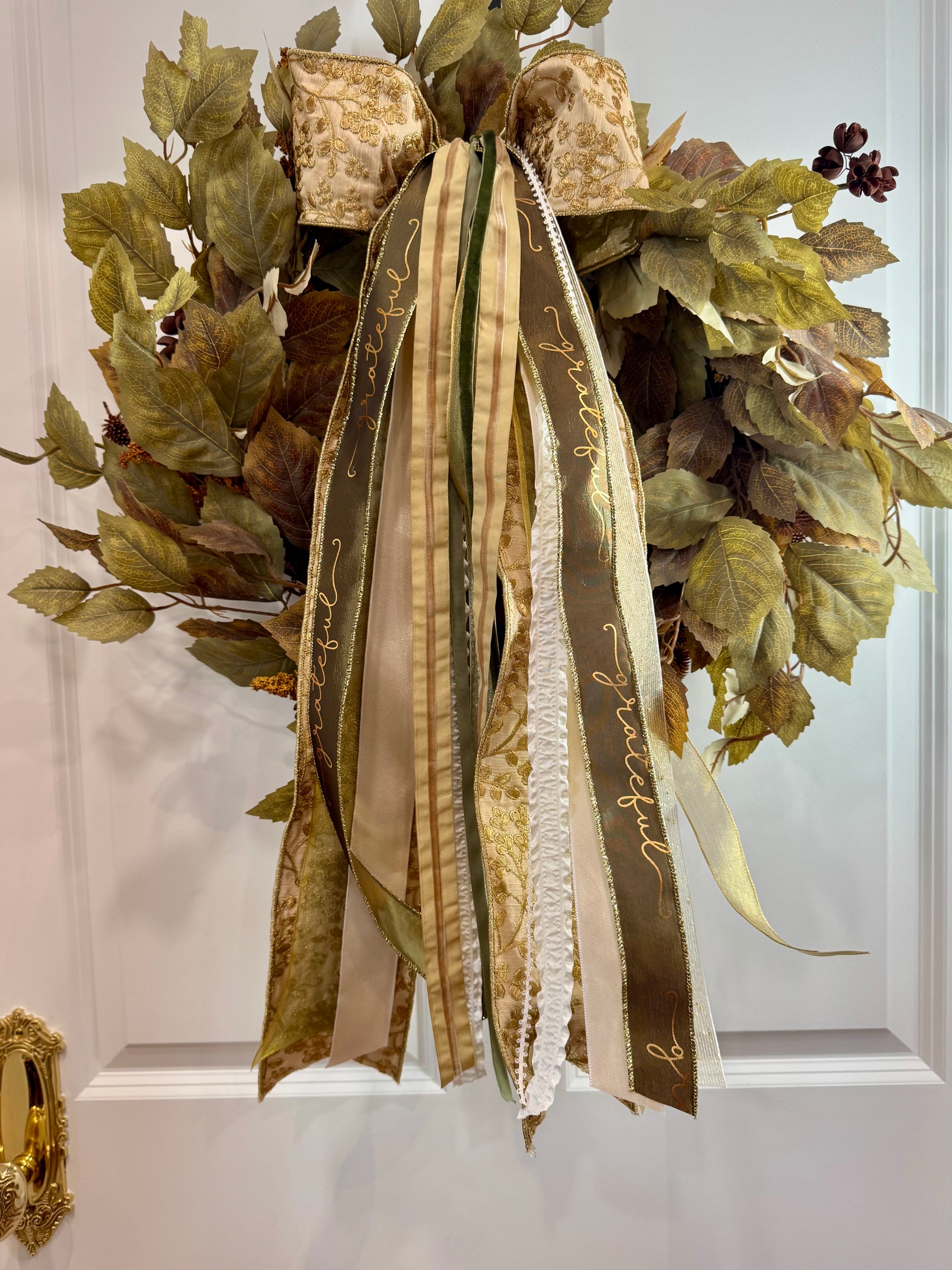 Our Grateful Gatherings ribbon set shines with elegance! A gorgeous golden brocade bow paired perfectly with gold and sage ribbons in a mix of textures and finishes, an elegant choice for this thankful time of year.