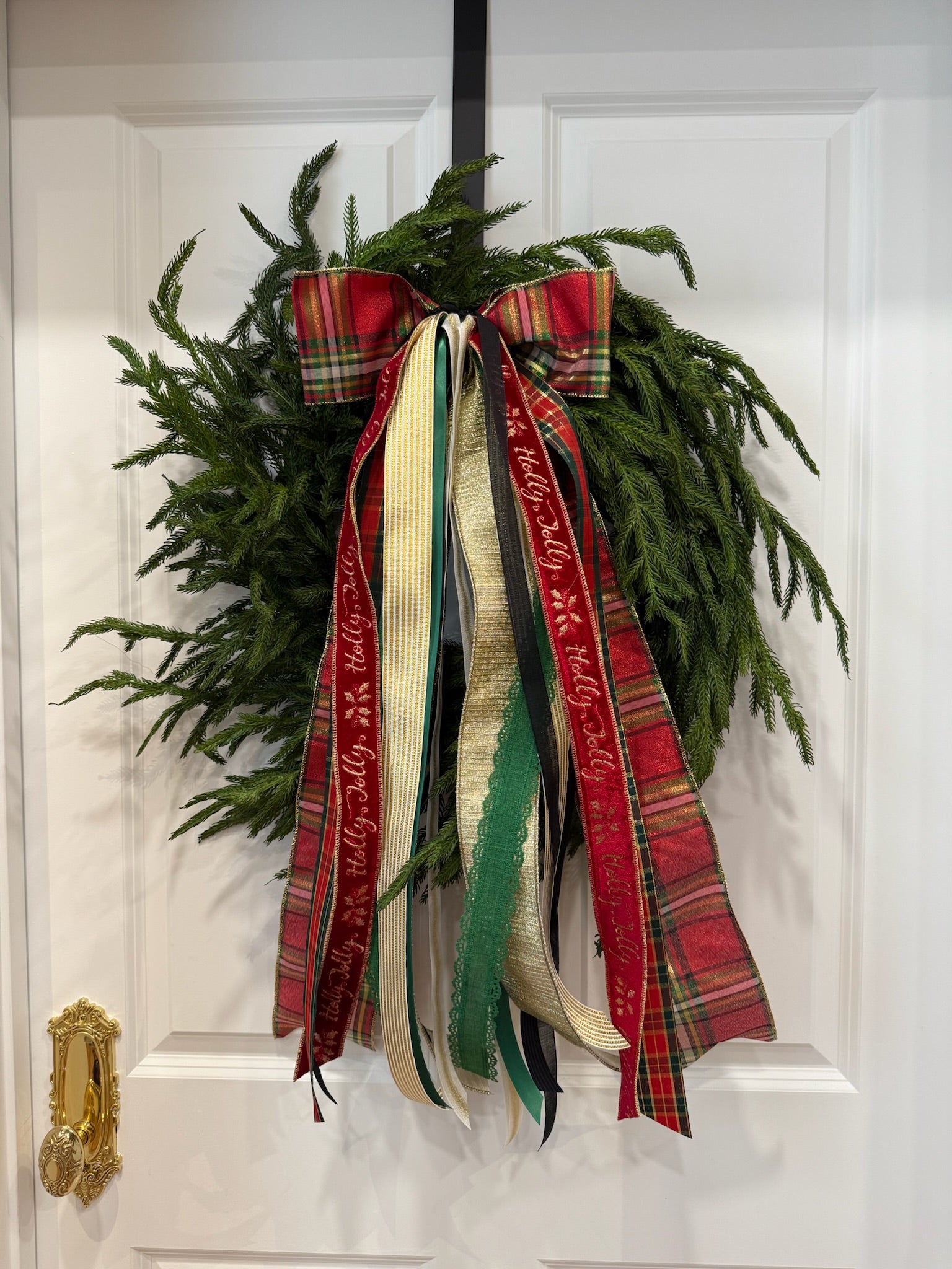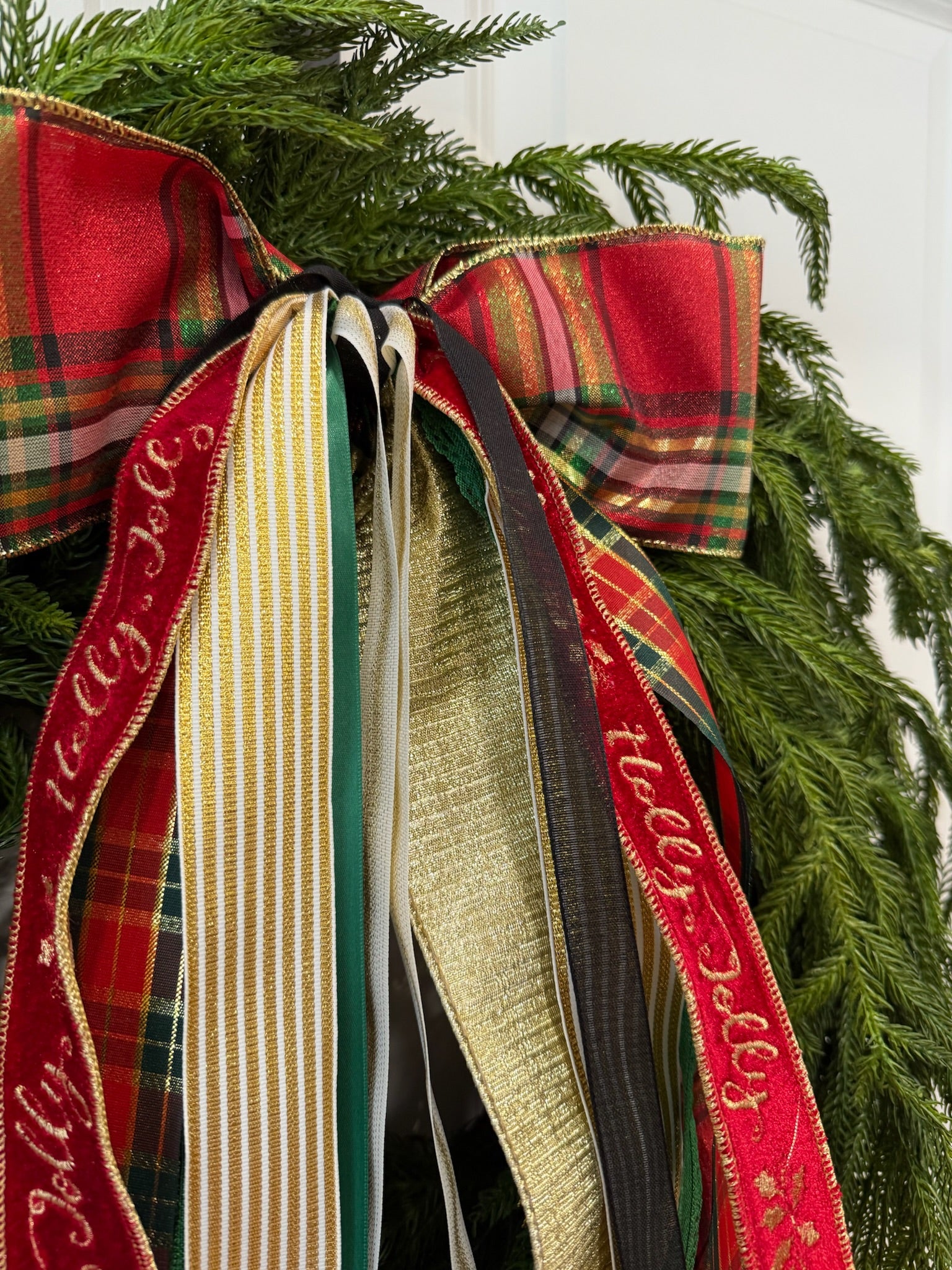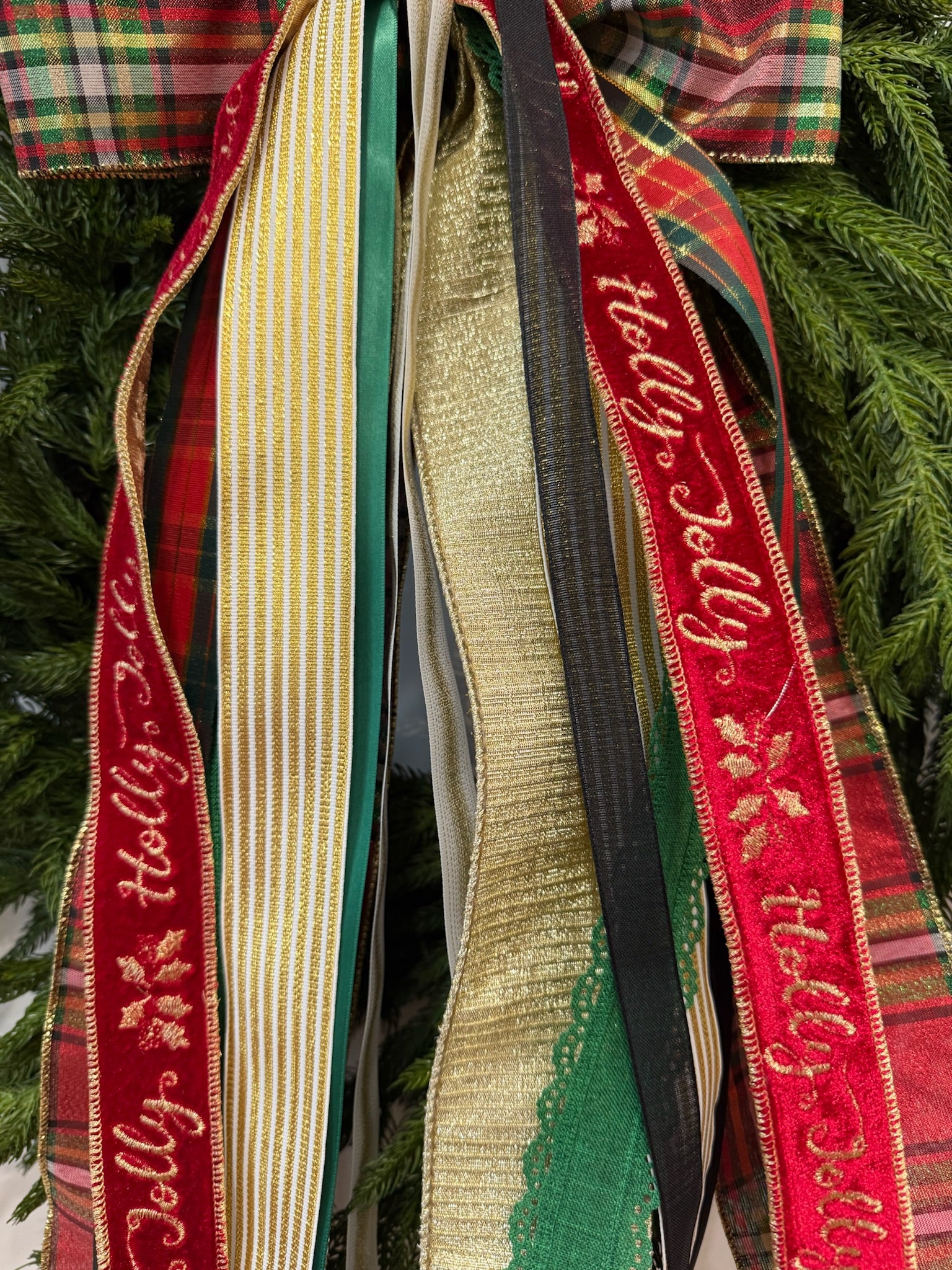 Holly Jolly Holiday showcases a stunning Christmas plaid bow in red, green, gold, and black. It’s beautifully layered with gold textured ribbon, an additional festive plaid, solid green eyelet-edged ribbon, cream ribbon with a gold stripe, gold-and-cream vertical stripes, rich black textured velvet, and a charming “Holly Jolly” velvet ribbon trimmed in gold.