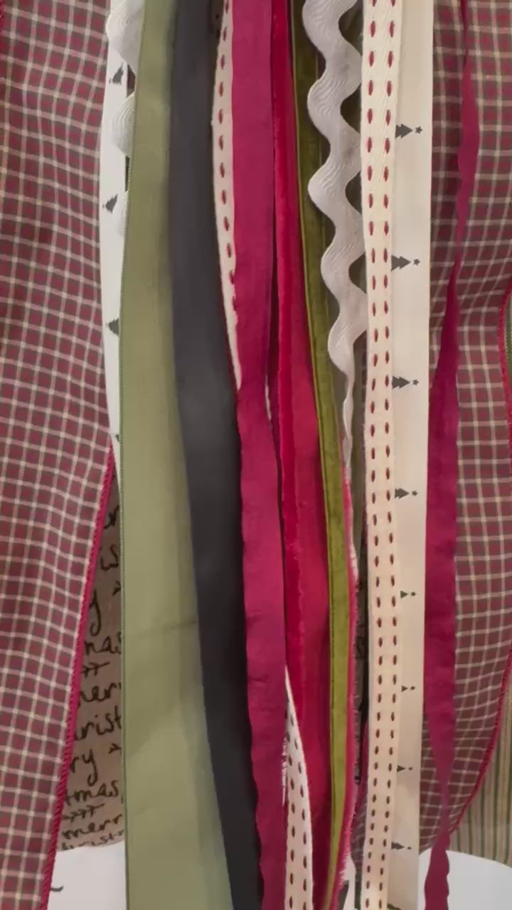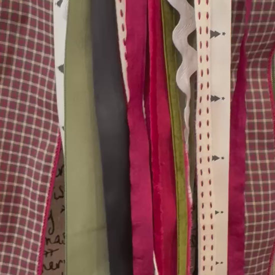 Our Homespun Christmas ribbon set has simple charm with a Merry Christmas bow in flax with black edging, green & flax vertical stripes, a country Christmas plaid, evergreen velvet, cream with red stitching, cream with printed Christmas trees, off-white ricrac, and tied together with deep red satin. The perfect blend of homespun-looking ribbons.