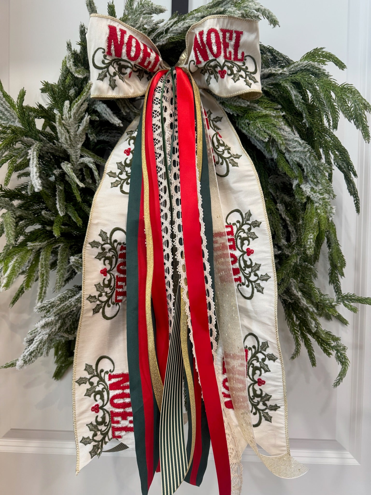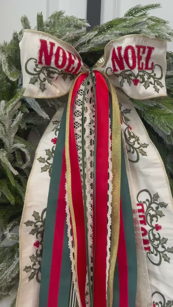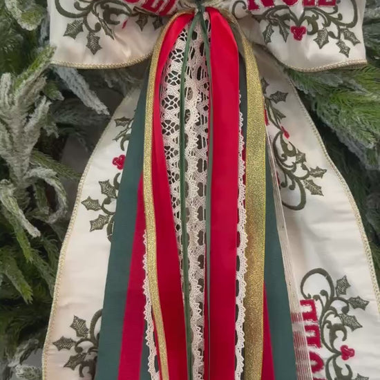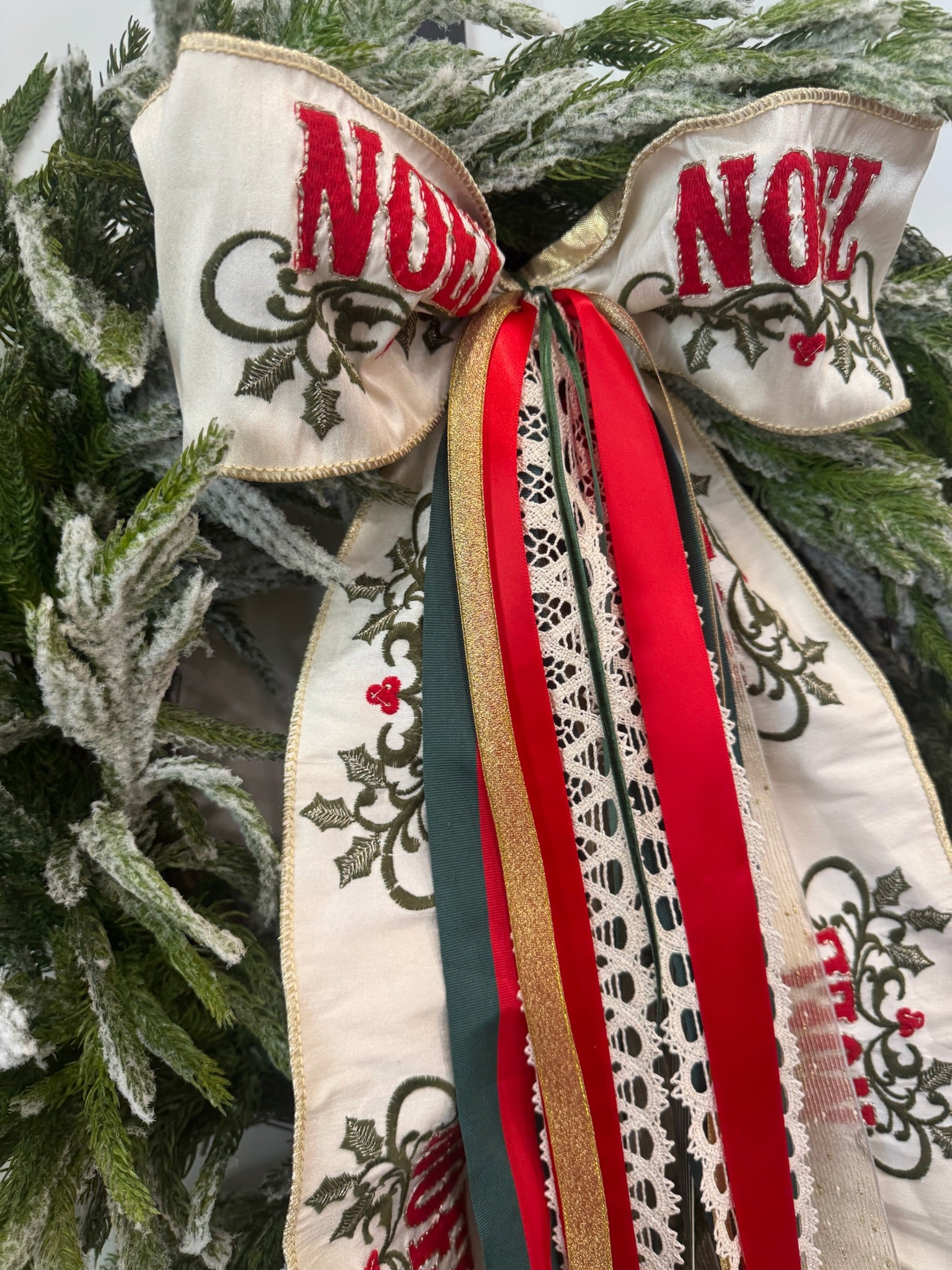 Our Joyous Noel ribbon set features a gorgeous 4" embroidered Noel satin bow, pine green & red striped grosgrain, cream & pine green pinstripe grosgrain, cream eyelet lace, gold sheen, sheer gold texture & mini pine green velvet. This set is the perfect classic Christmas bundle.