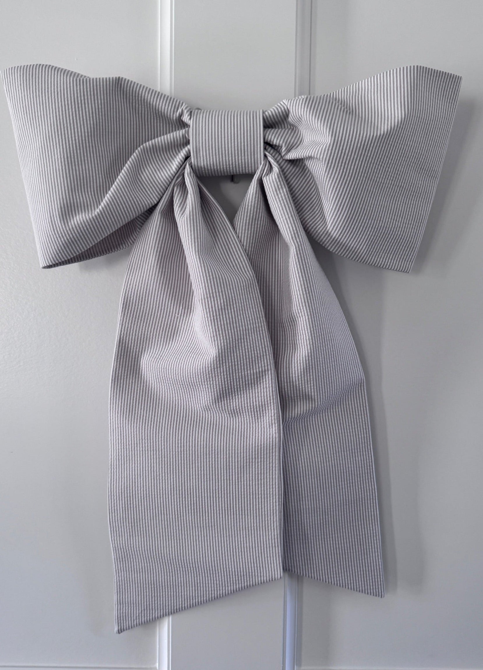 Our Lauren Oviatt Khaki Seersucker Grand Bow is a stunning high-end fabric curated by Lauren and created locally by our professional seamstresses. Dimensions are measured at the widest points. Depth is determined by you and can be flat or puffed out 2-5". All bows are handmade and sizes can very slightly.