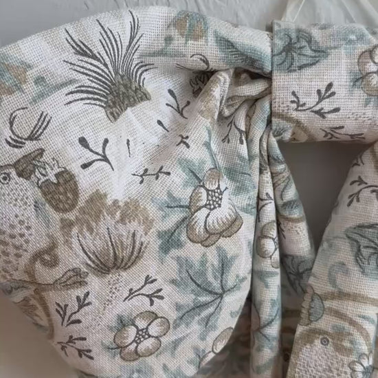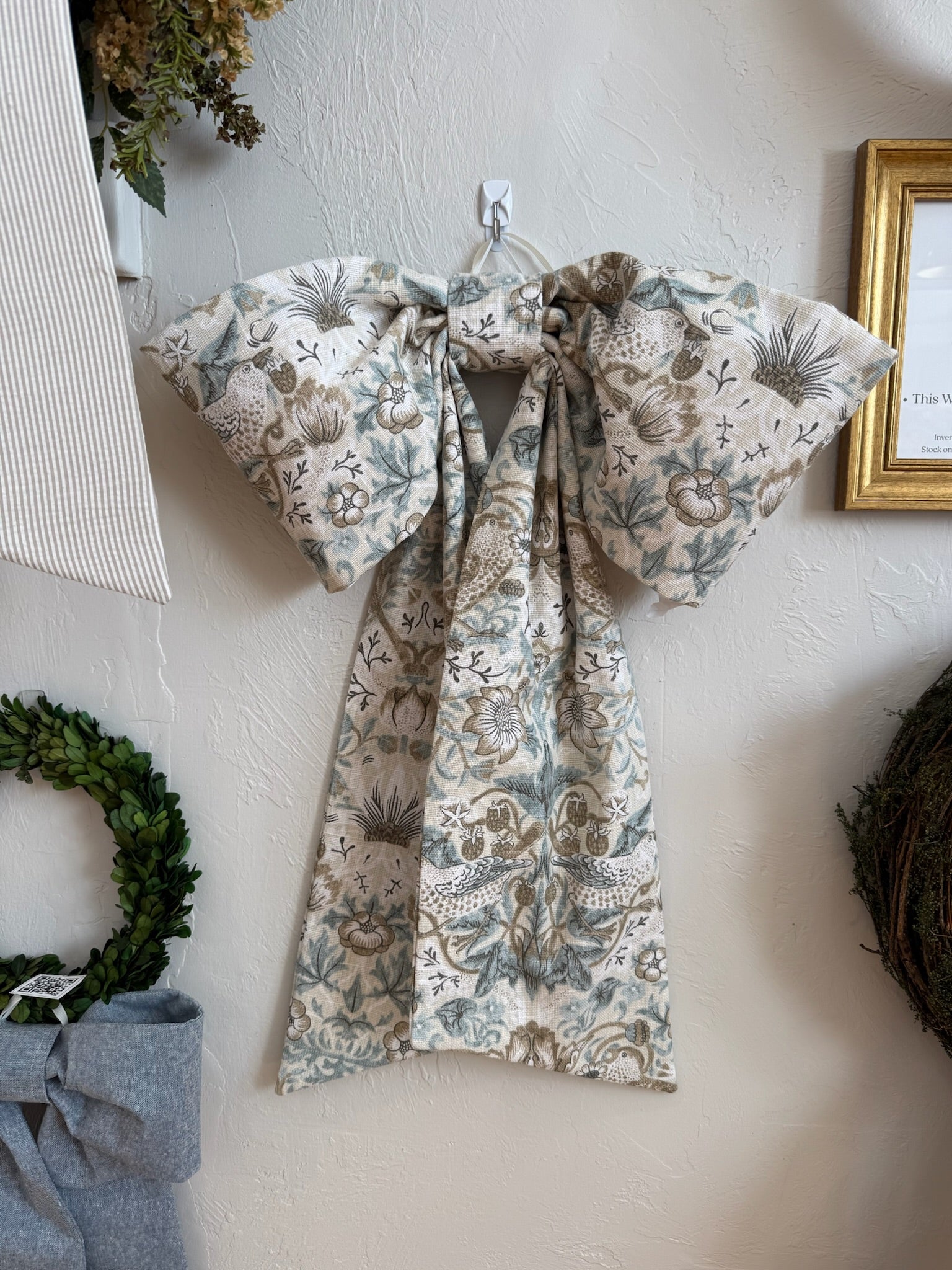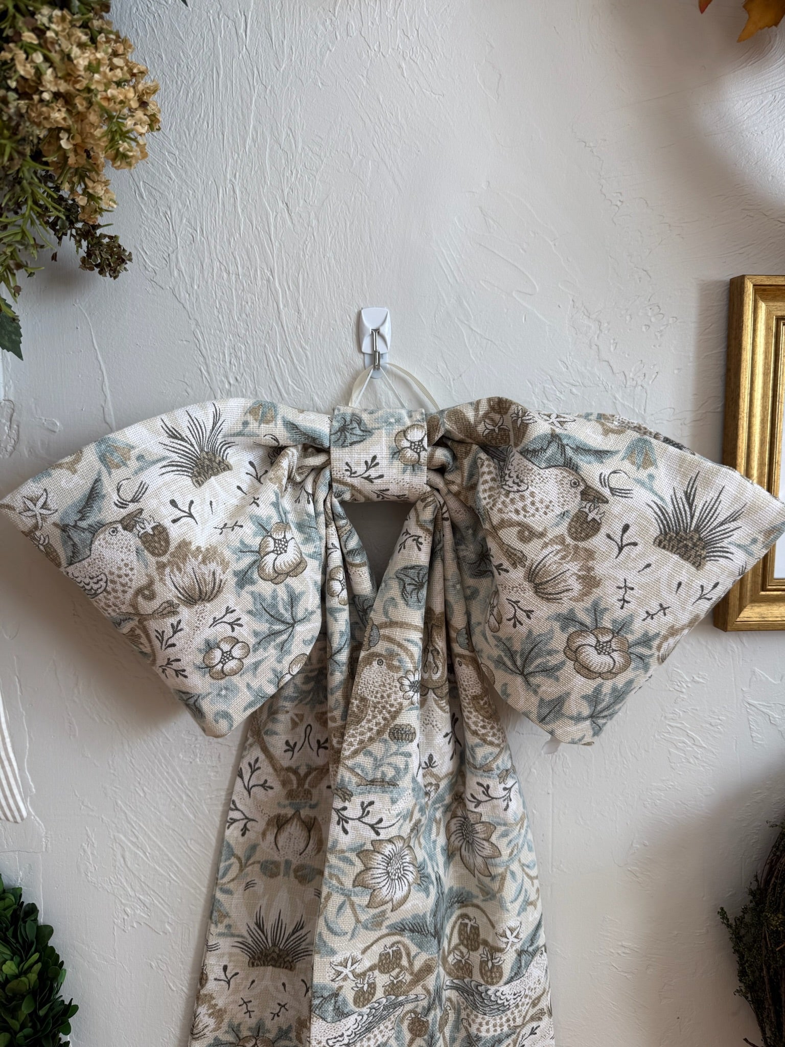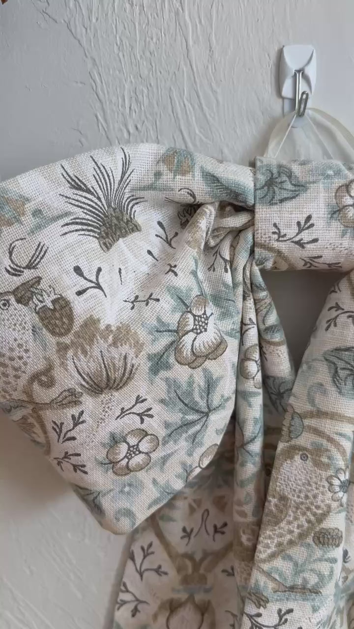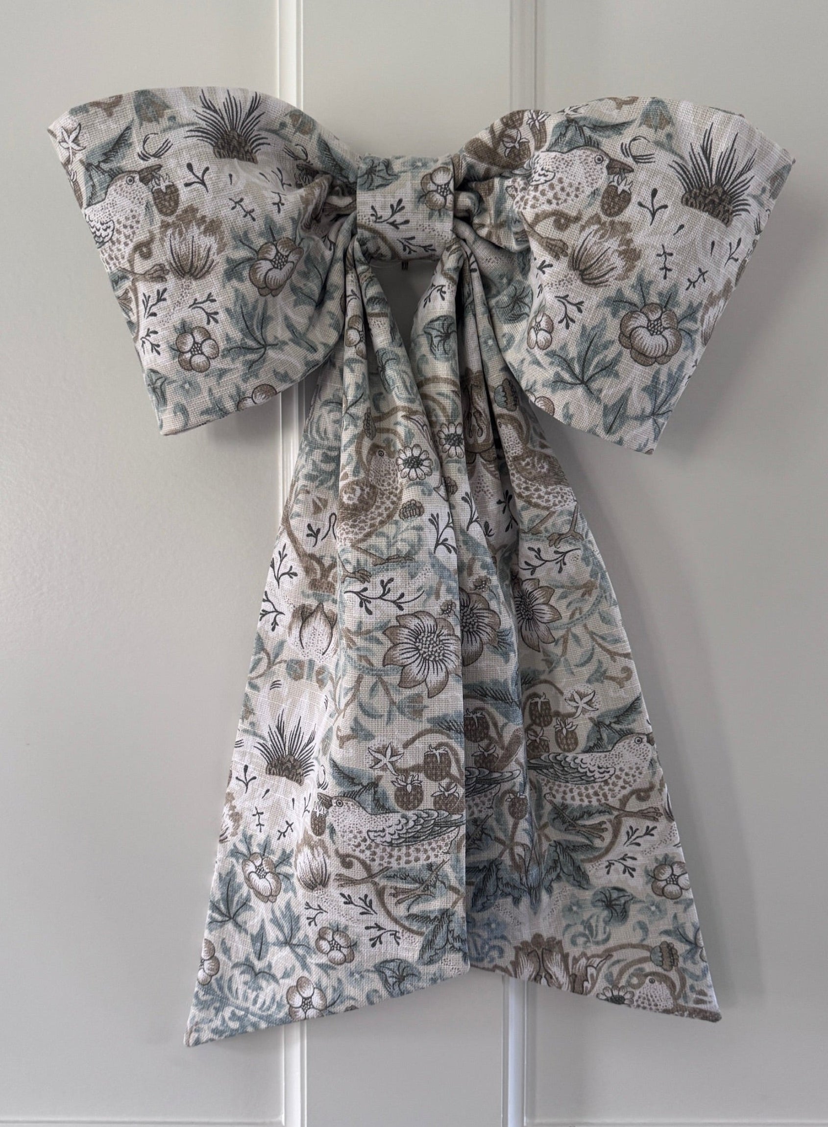 Our Lauren Oviatt Strawberry Thief Blue Grand Bow is a stunning high-end fabric curated by Lauren and created locally by our professional seamstresses. Dimensions are measured at the widest points. Depth is determined by you and can be flat or puffed out 2-5". All bows are handmade and sizes can very slightly.