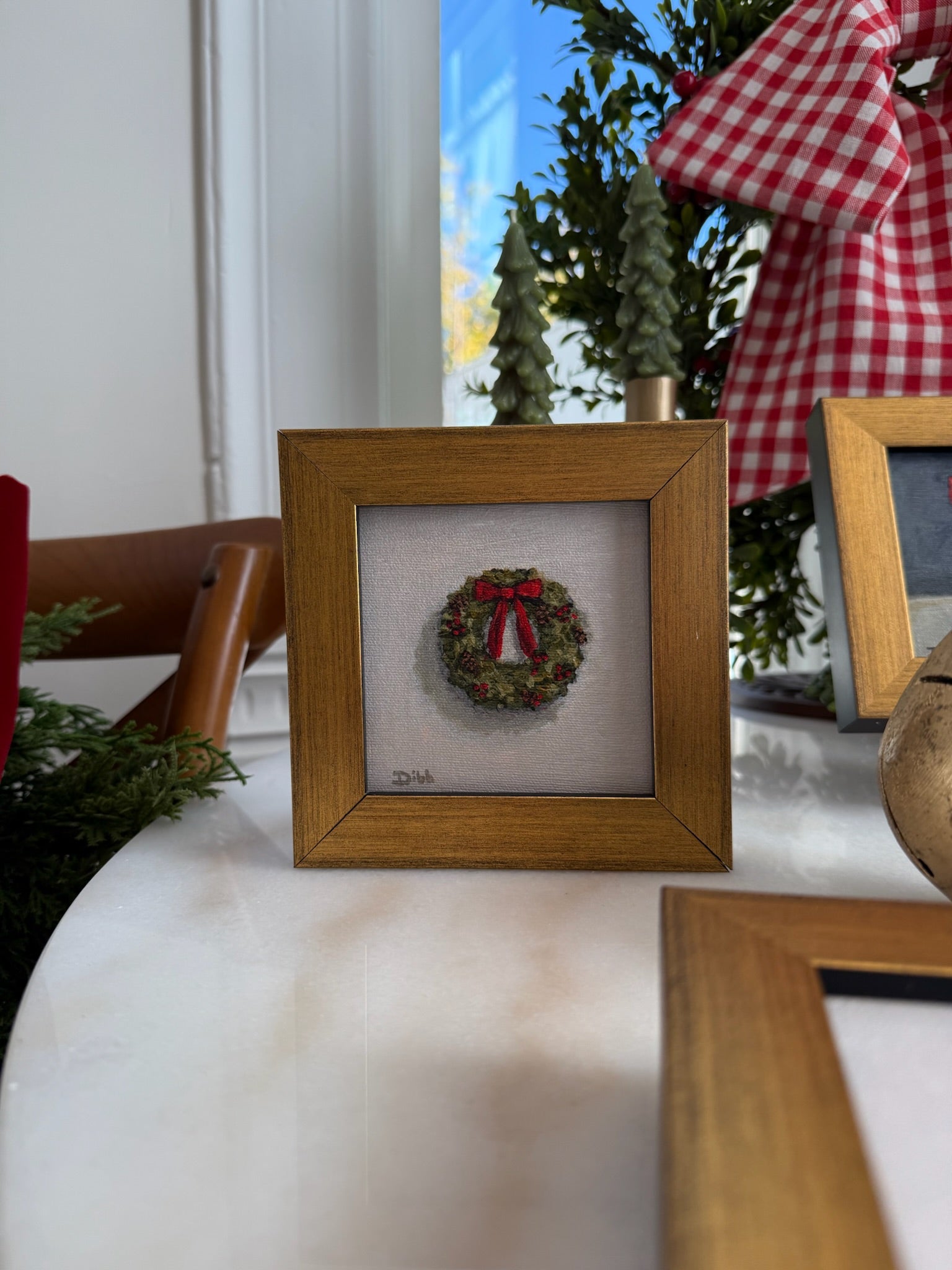 Libby Dibb for Spool House "Wreath" 4x4 Framed Giclee features a timeless Christmas wreath set against a neutral backdrop.