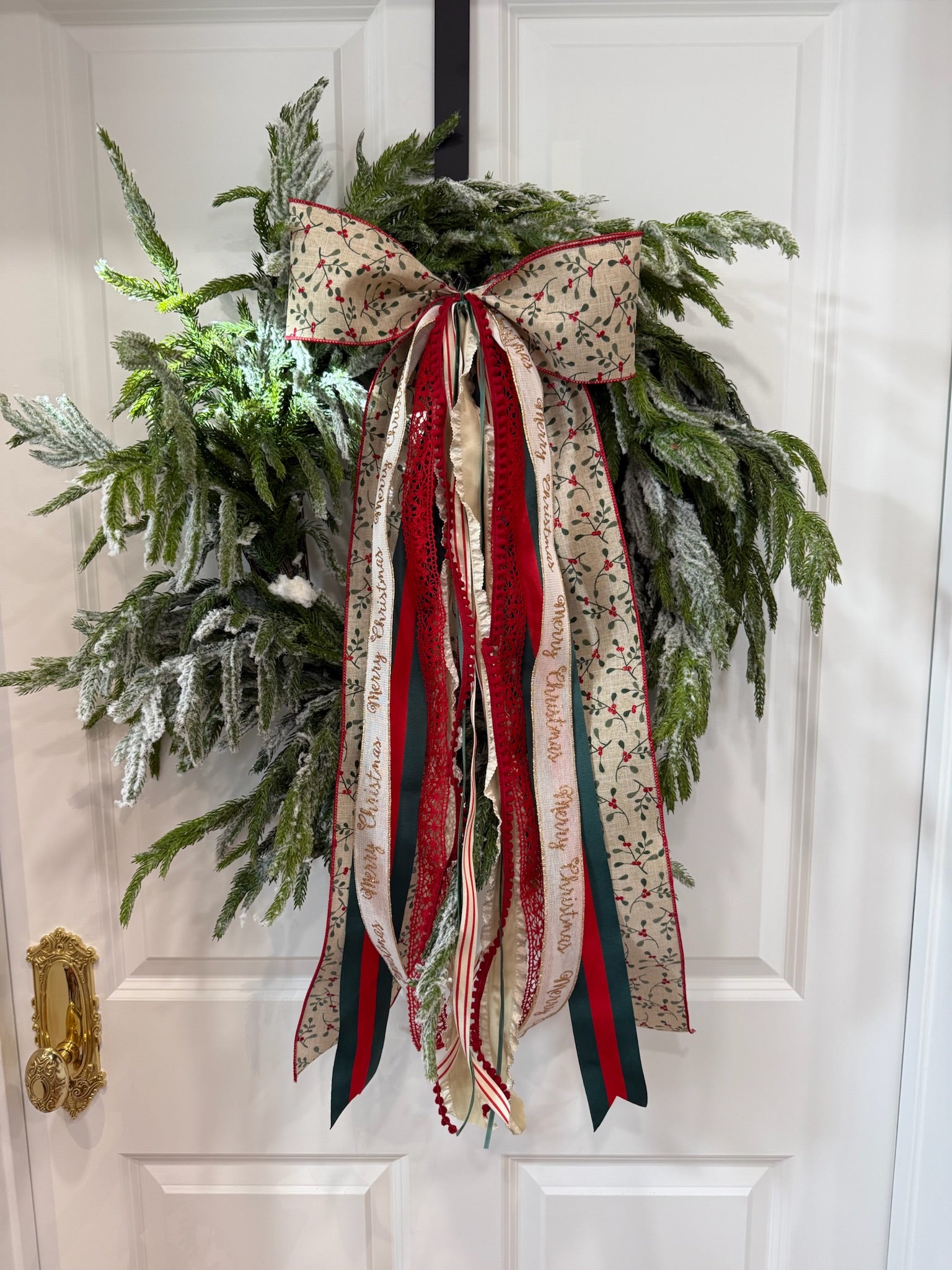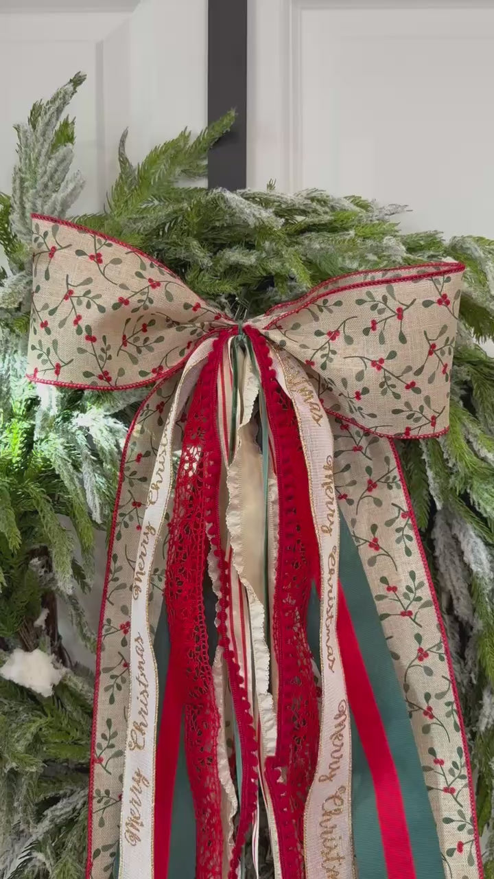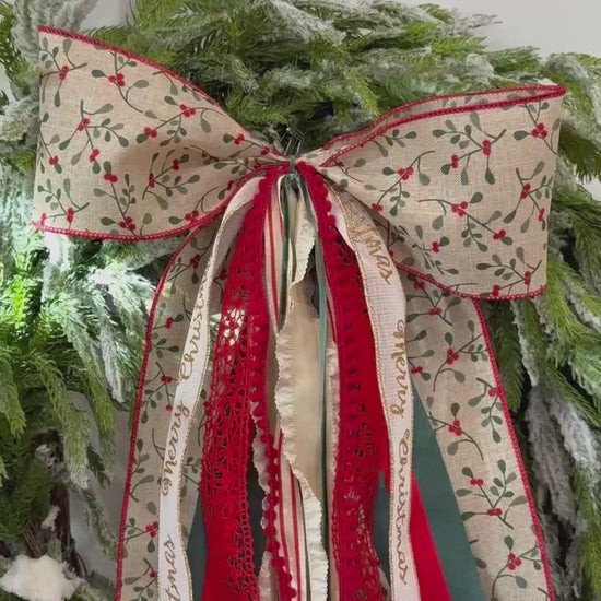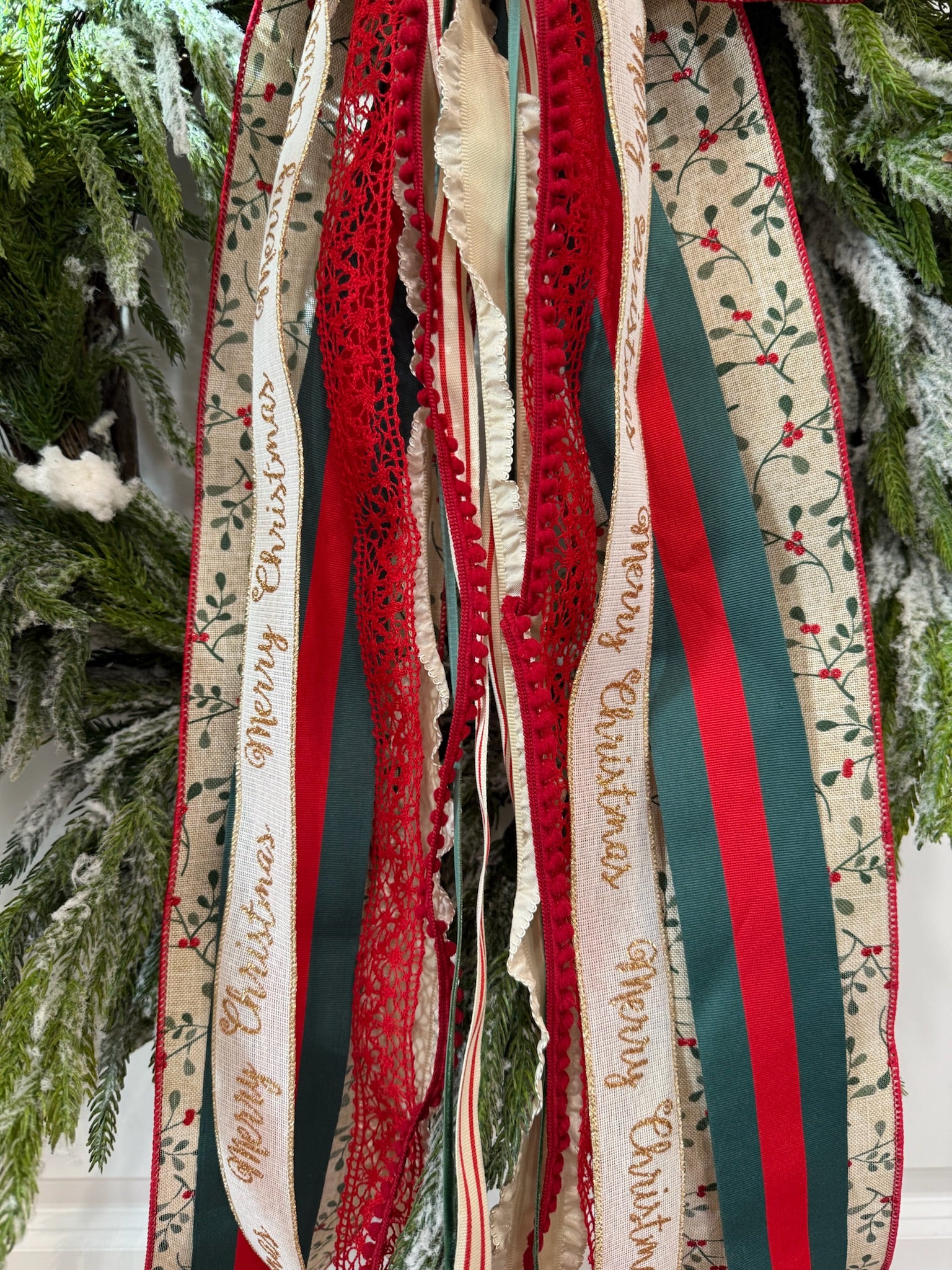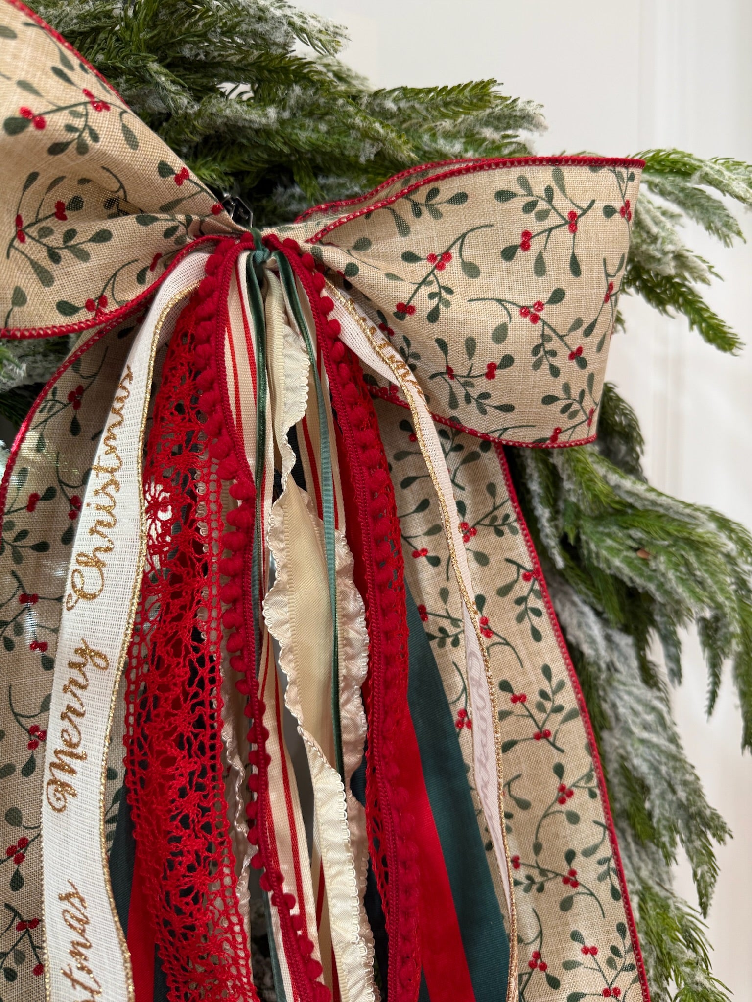 A festive holly bow, red & green stripe grosgrain, red lace, cream ruffle-edge satin, red mini-poms, cream with red mini stripes and a Merry Christmas ribbon make this set the perfect Midwest Christmas!