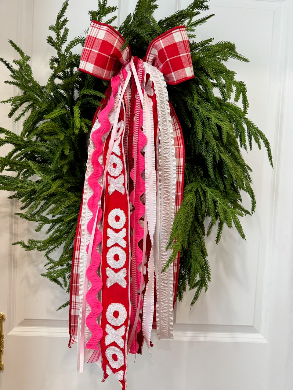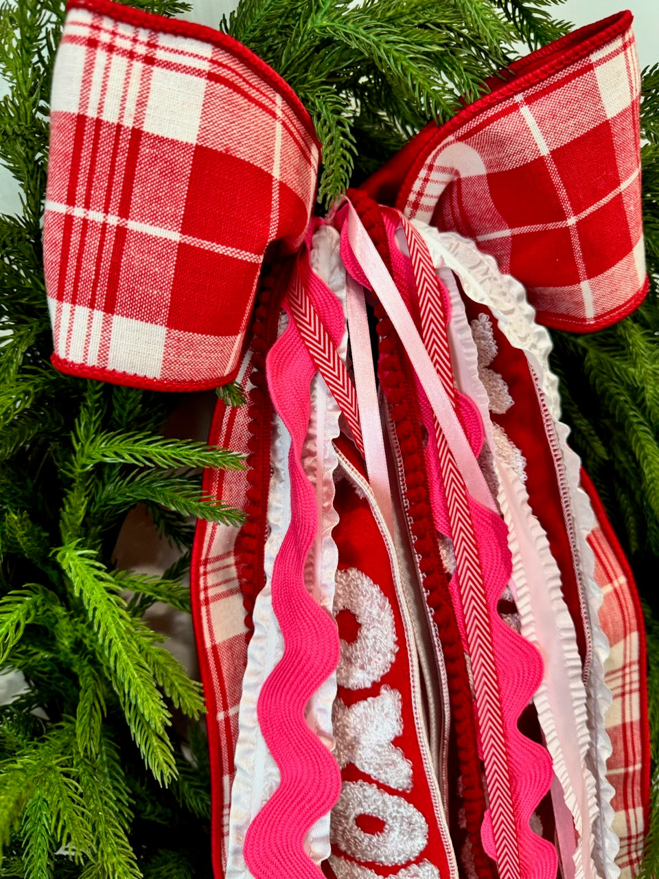 XOXO ribbon set features a 4" red & white plaid bow along with fabulous ribbons in pinks, reds and whites. Including plaids, ricracs, ruffles, solids & satins. The chenille XOXO is a heartthrob!