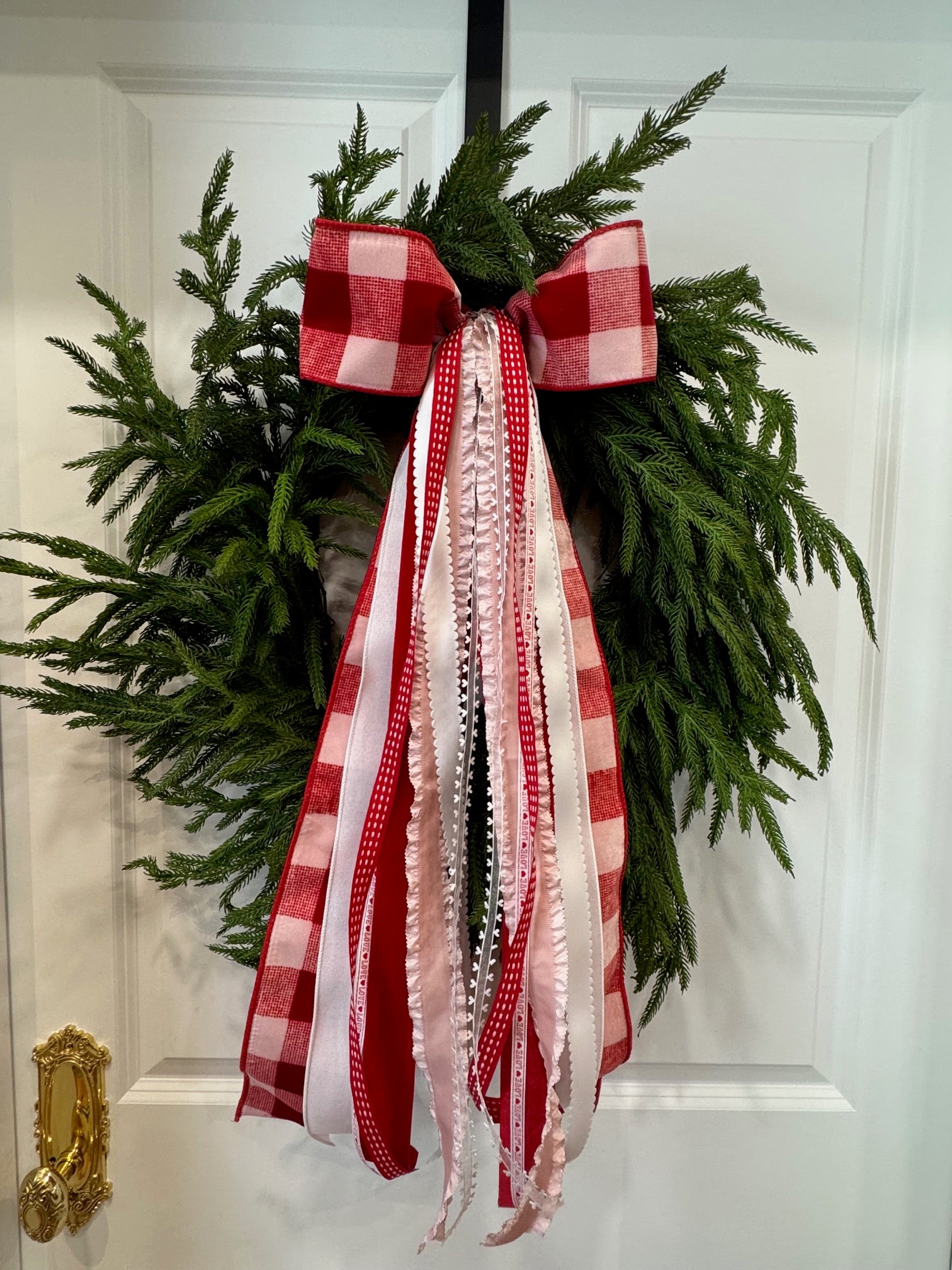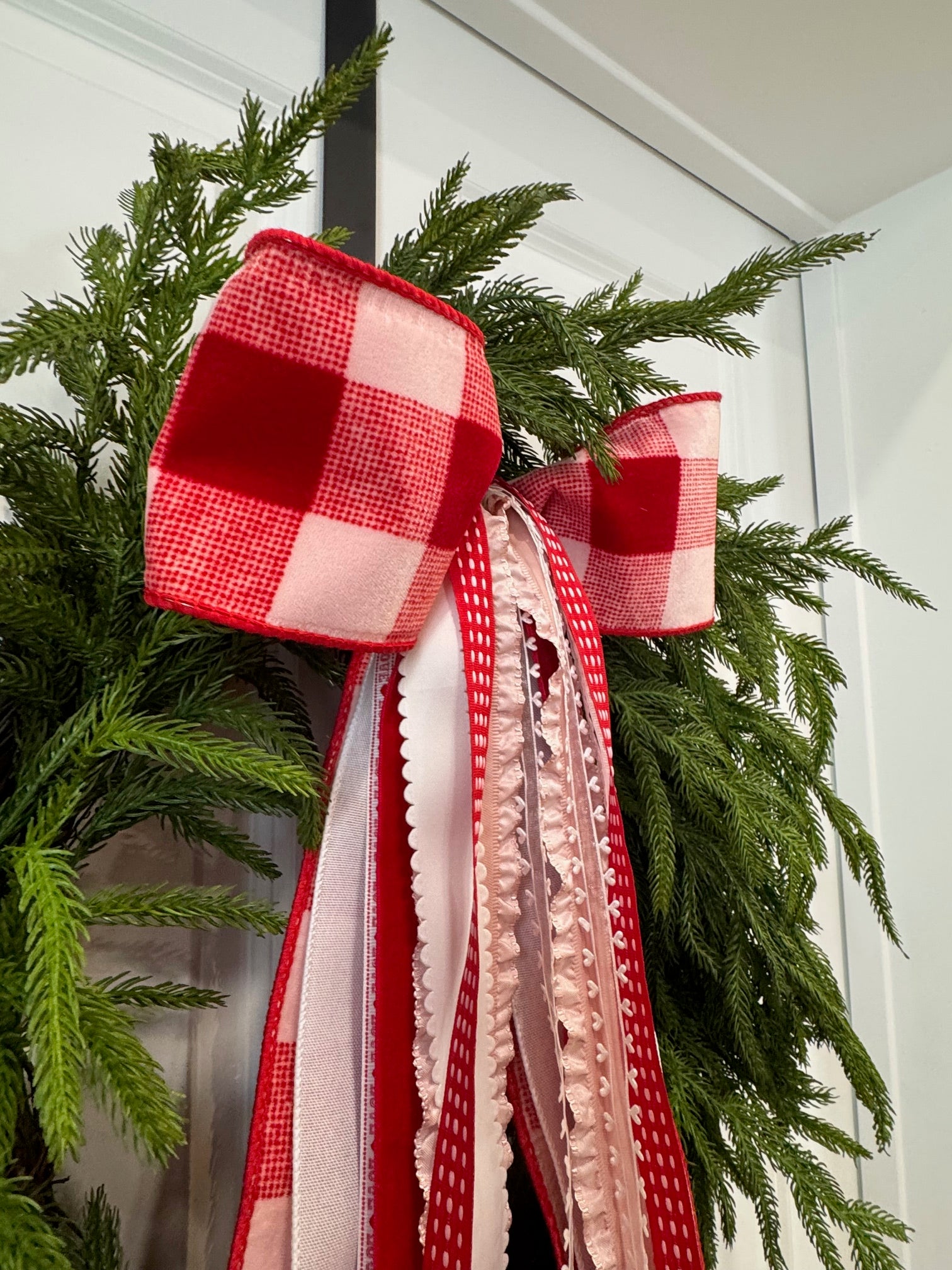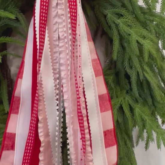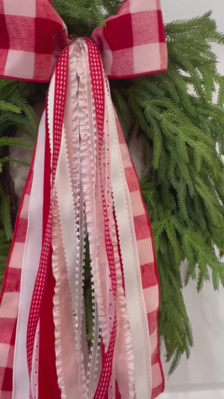 Checkin' You Out ribbon set features a darling 4" red & pink checked bow along with soft pink ruffle, white scallop, red with white stitiching, solid red, solid white, sheer white with mini hearts and little red hearts on repeat. This is one ribbon set you'll be checking out.