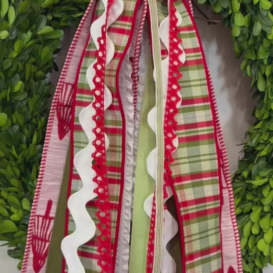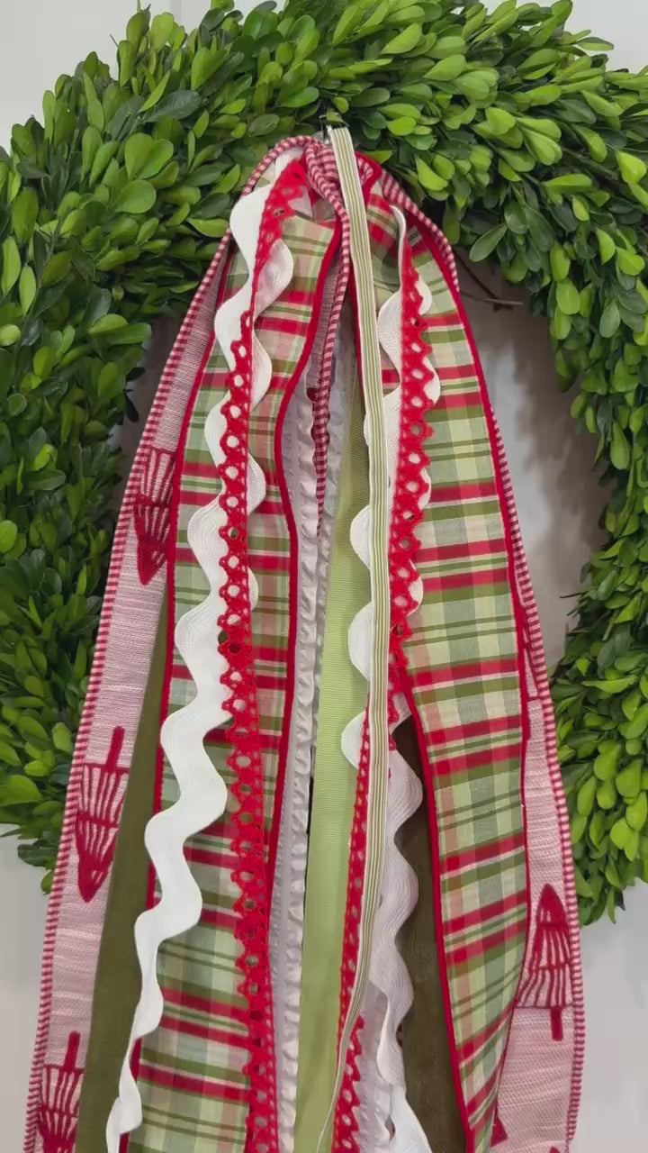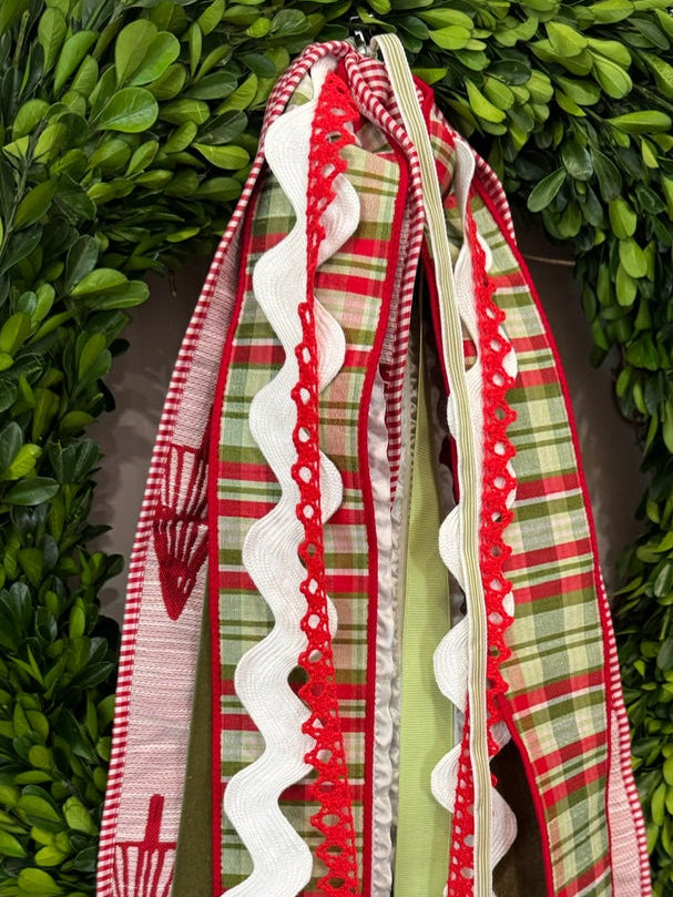 O Christmas Tree features a fabulous 4" red & white textured ribbon with embroidered red Christmas trees that is edged in red & white striped trim, a traditional holiday-colored satin plaid, jumbo white ricrac, evergreen velvet, light green crepe, delicate red lace, & thin white & light green vertical stripe to tie it all together.