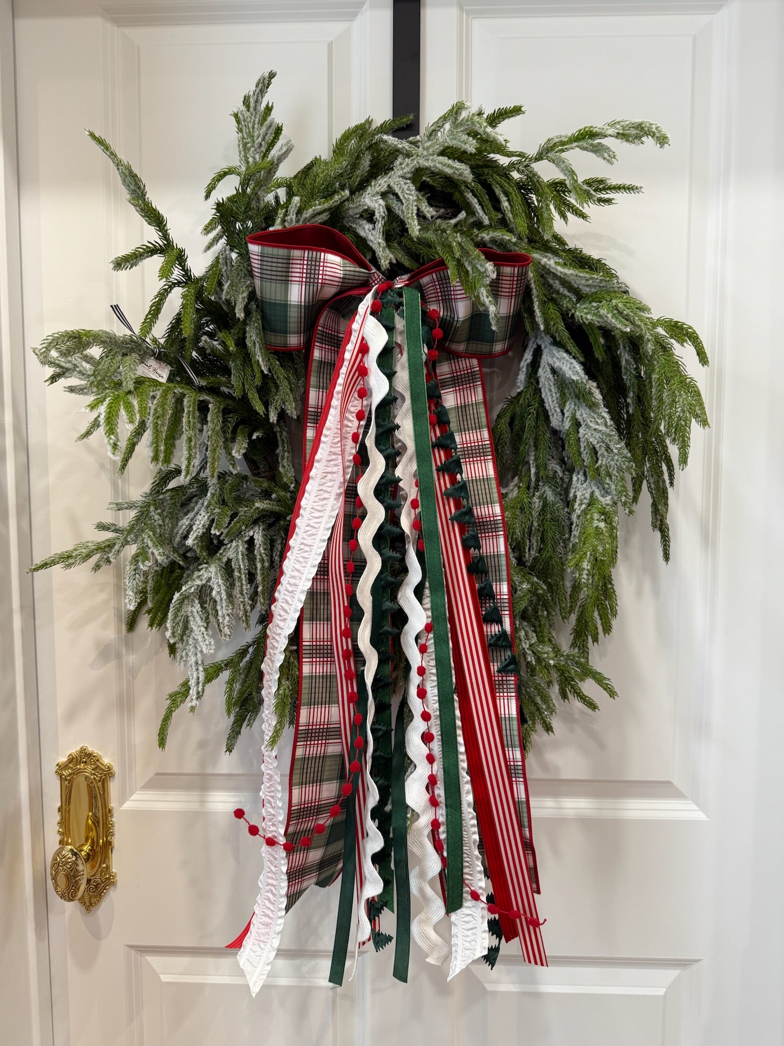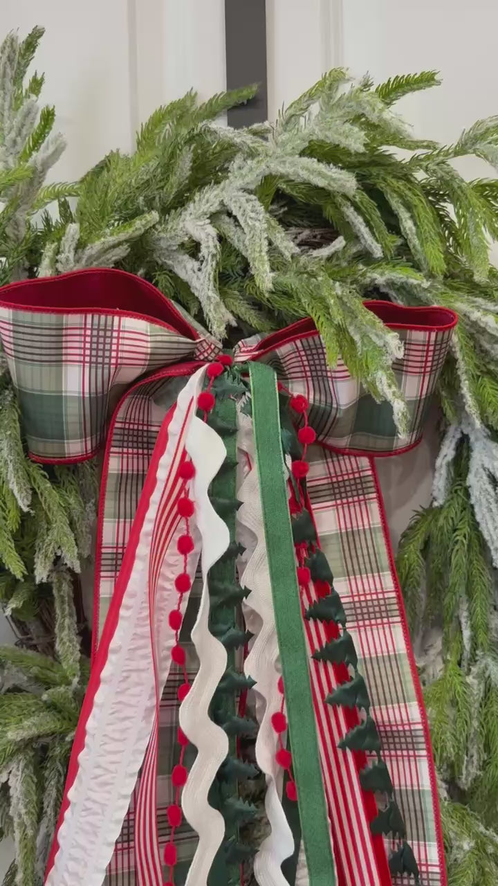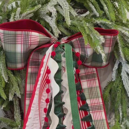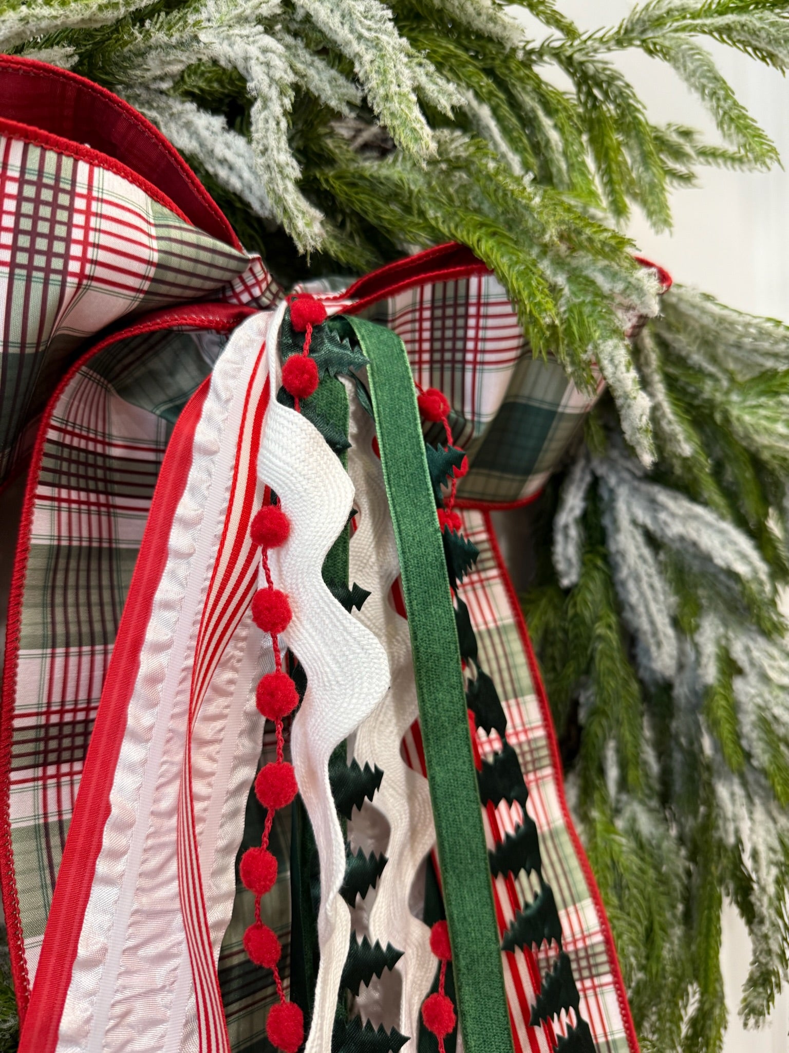 Oh Tannenbaum features a 4” traditional plaid bow, white ruffle satin, evergreen velvet, red & white stripe grosgrain, red textured velvet, jumbo white ricrac, evergreen seam binding and lazer-cut Christmas trees