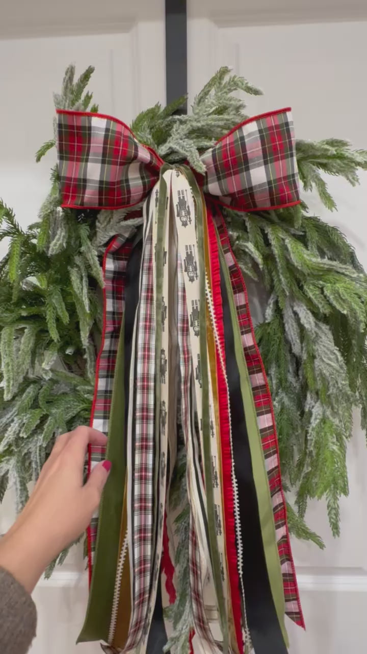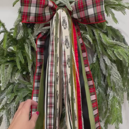 Plaid & Nutcracker Noel is a fabulous holiday ribbon set featuring a Stewart Tartan bow, a mini stewart tartan plaid, black satin, evergreen velvet, deep gold velvet, red ruffle-edge satin, mini cream hook lace, cream with black stripe grosgrain, cream with thin gold stripes, and a festive nutcracker too!