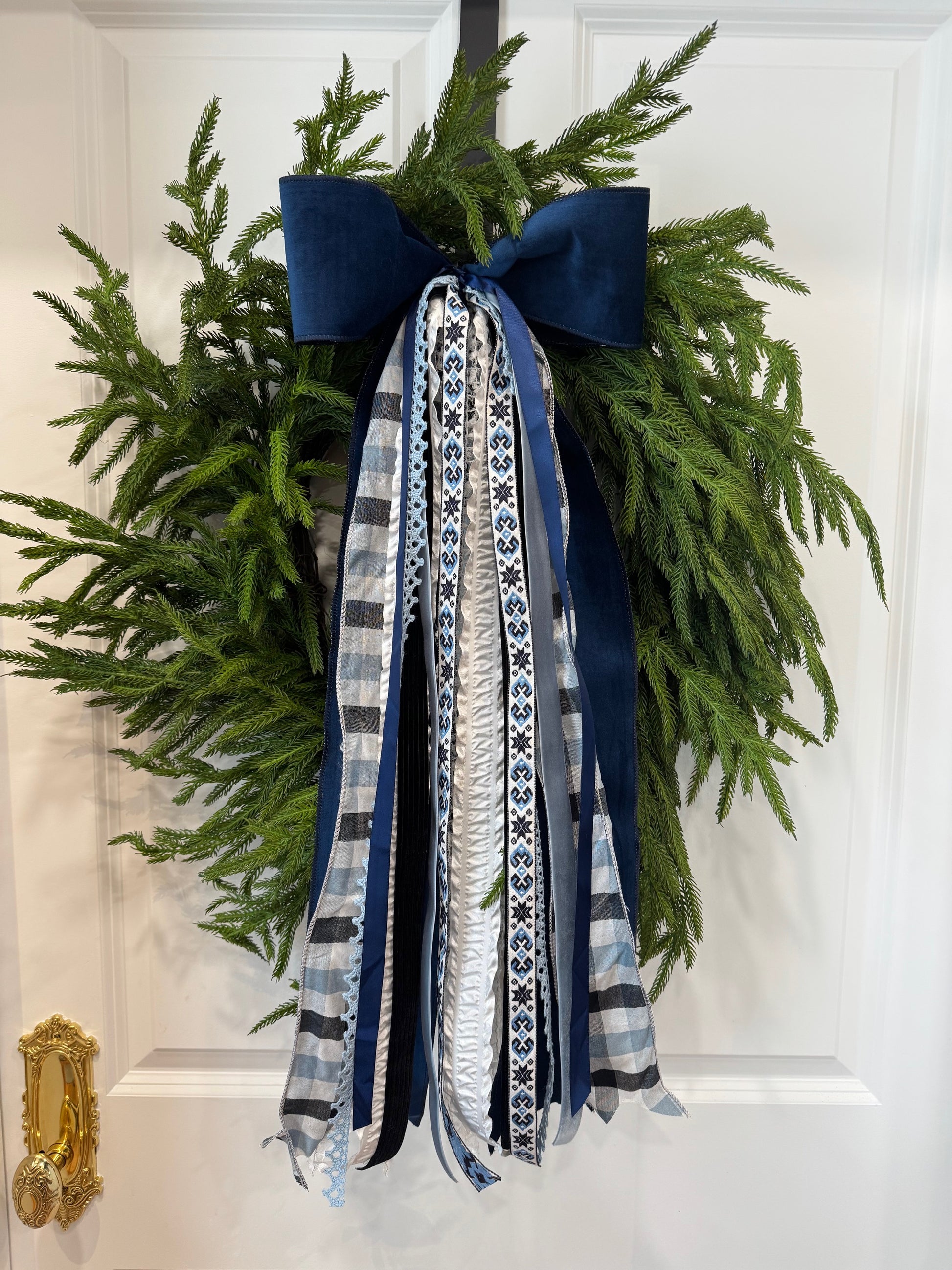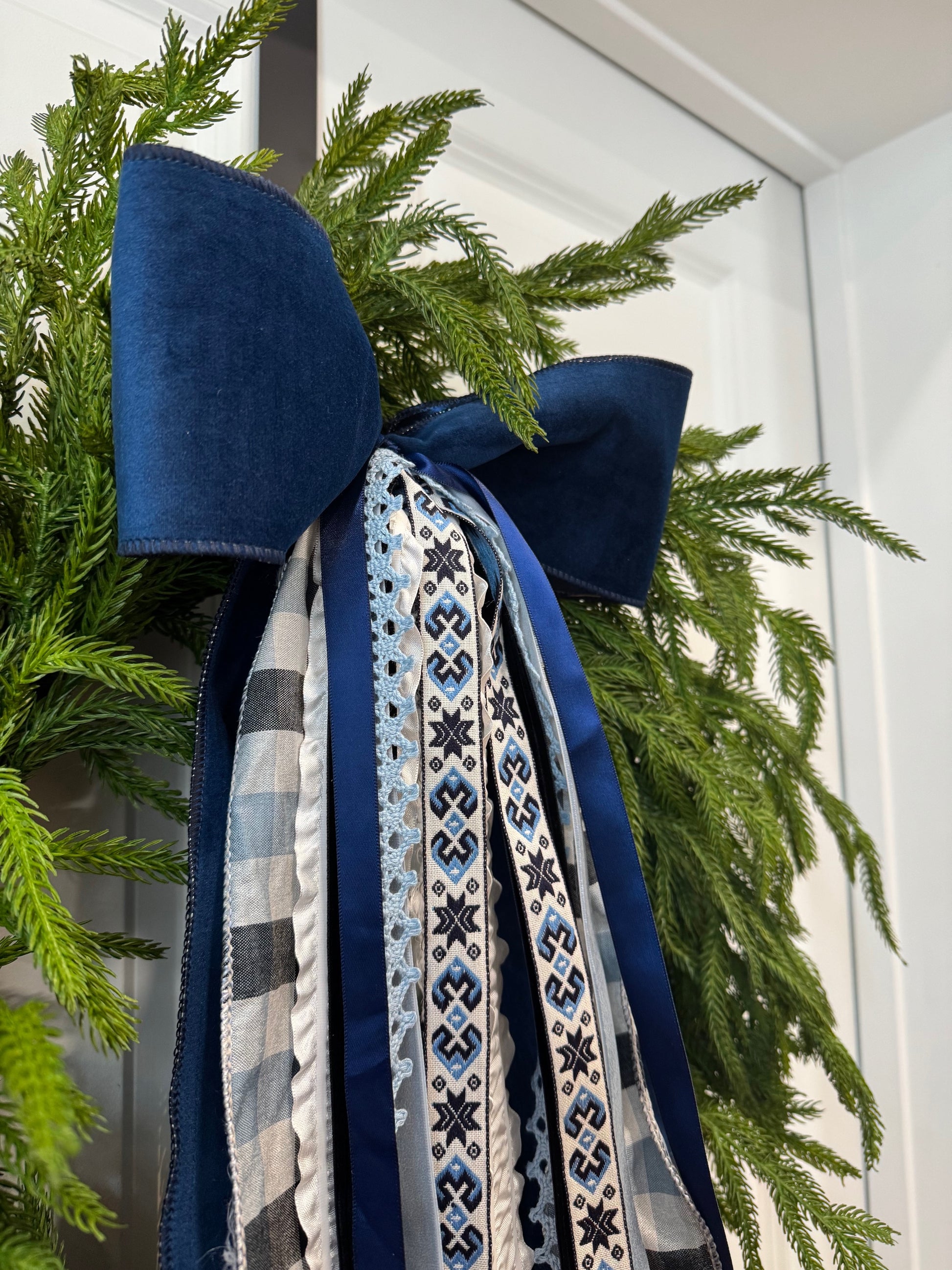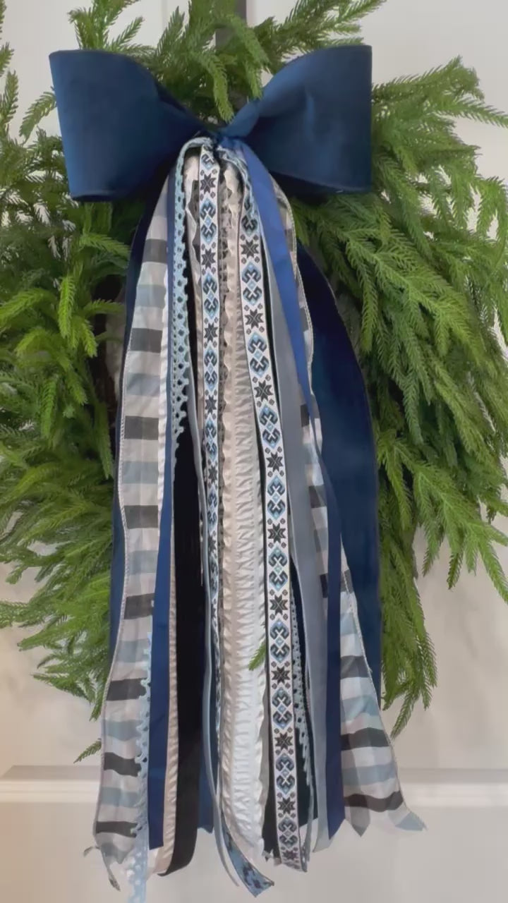 Winter Blues ribbon set features a 4" velvet bow, followed by whites, blacks and blues all perfectly paired, The soft blue lace and jacquard winter pattern are definitely highlights in this wintry set.