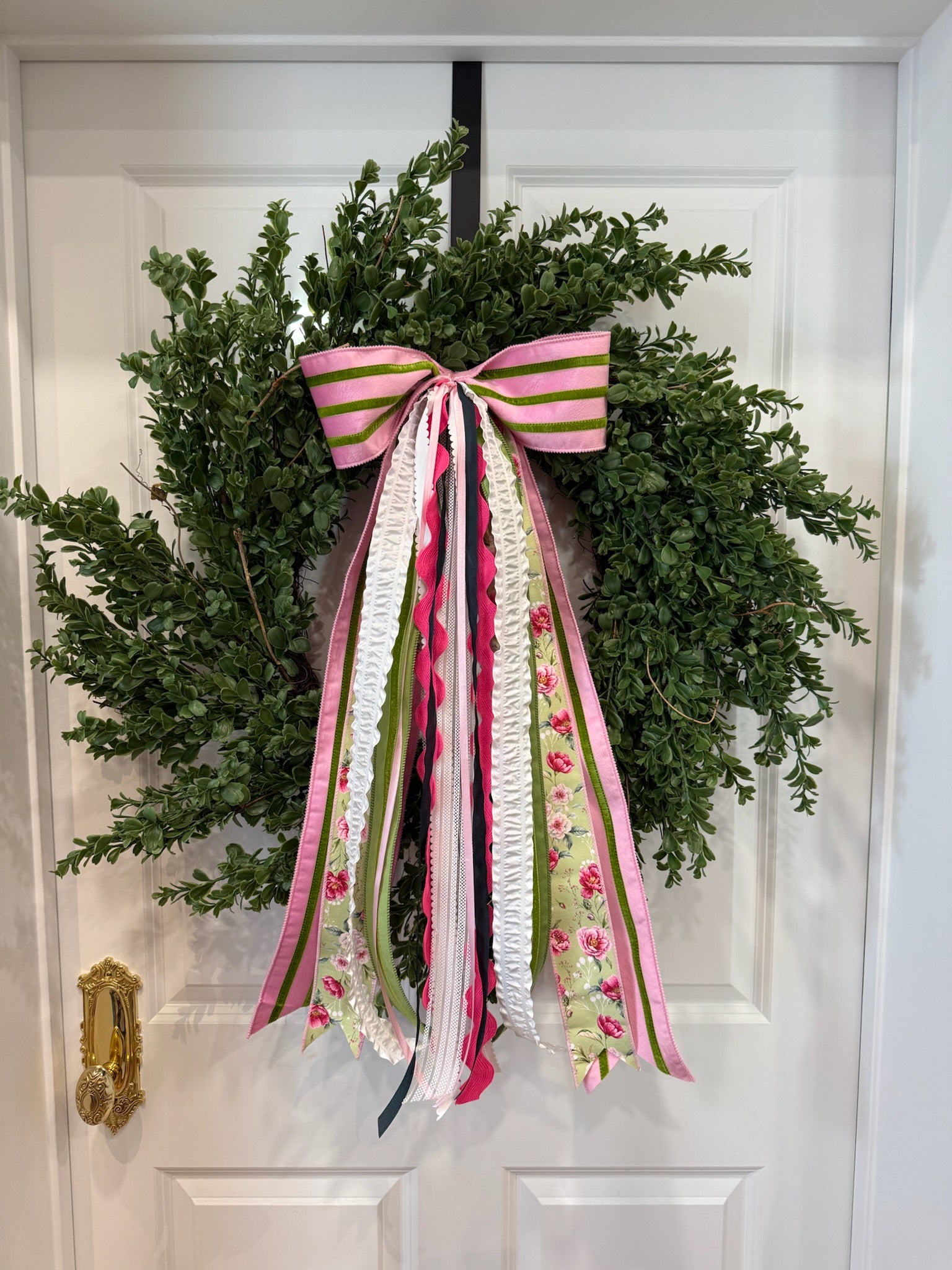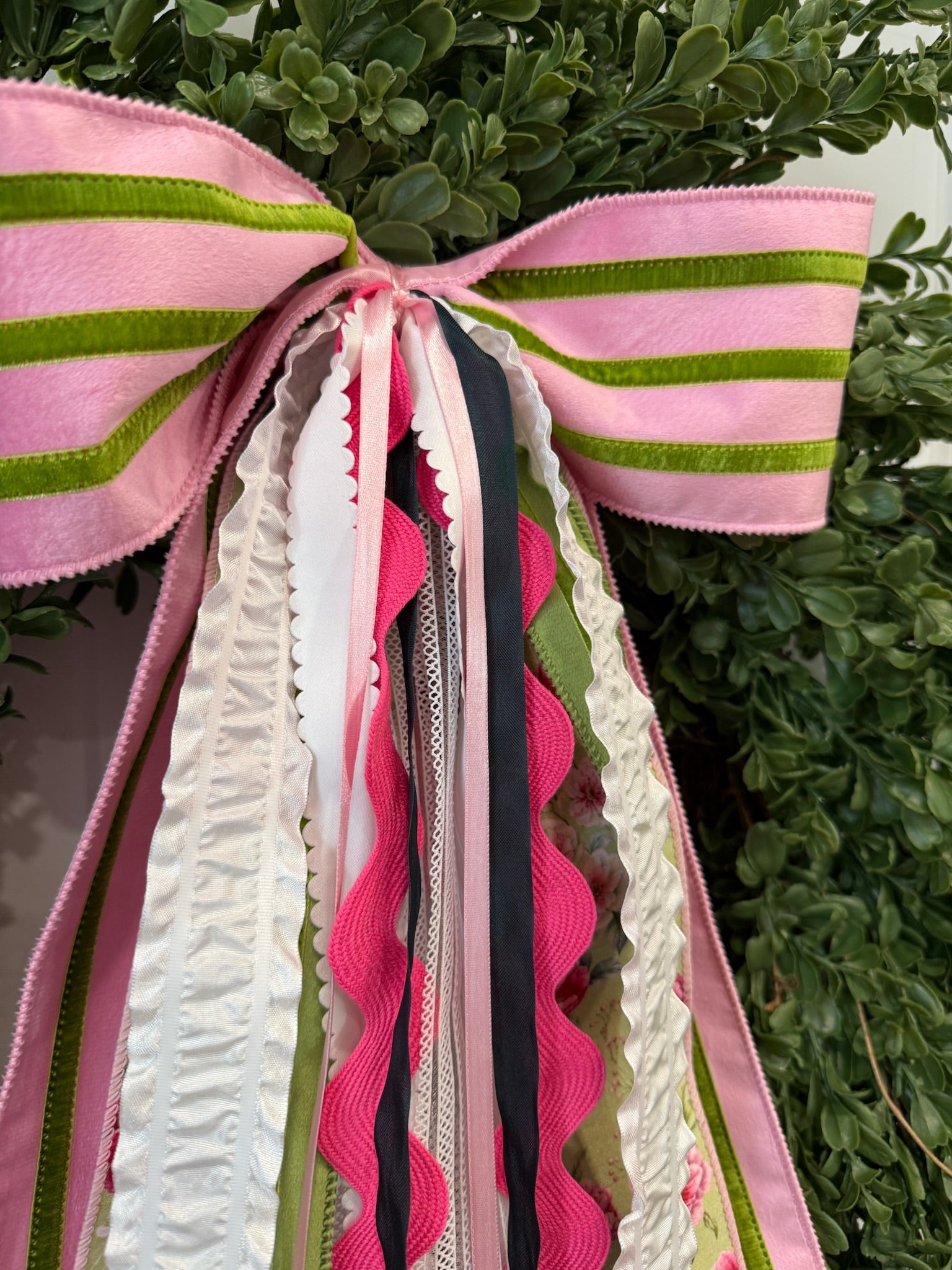 Our Spring Fling ribbon set is bright, sweet, and full of color. It starts with a pink satin and bright green velvet striped bow, then layers in green ribbon with pink flowers, white ruffle satin, solid bright and dark green ribbons, sheer white with vertical stripes, jumbo bright pink ricrac, and is all tied together with a soft pink ribbon.