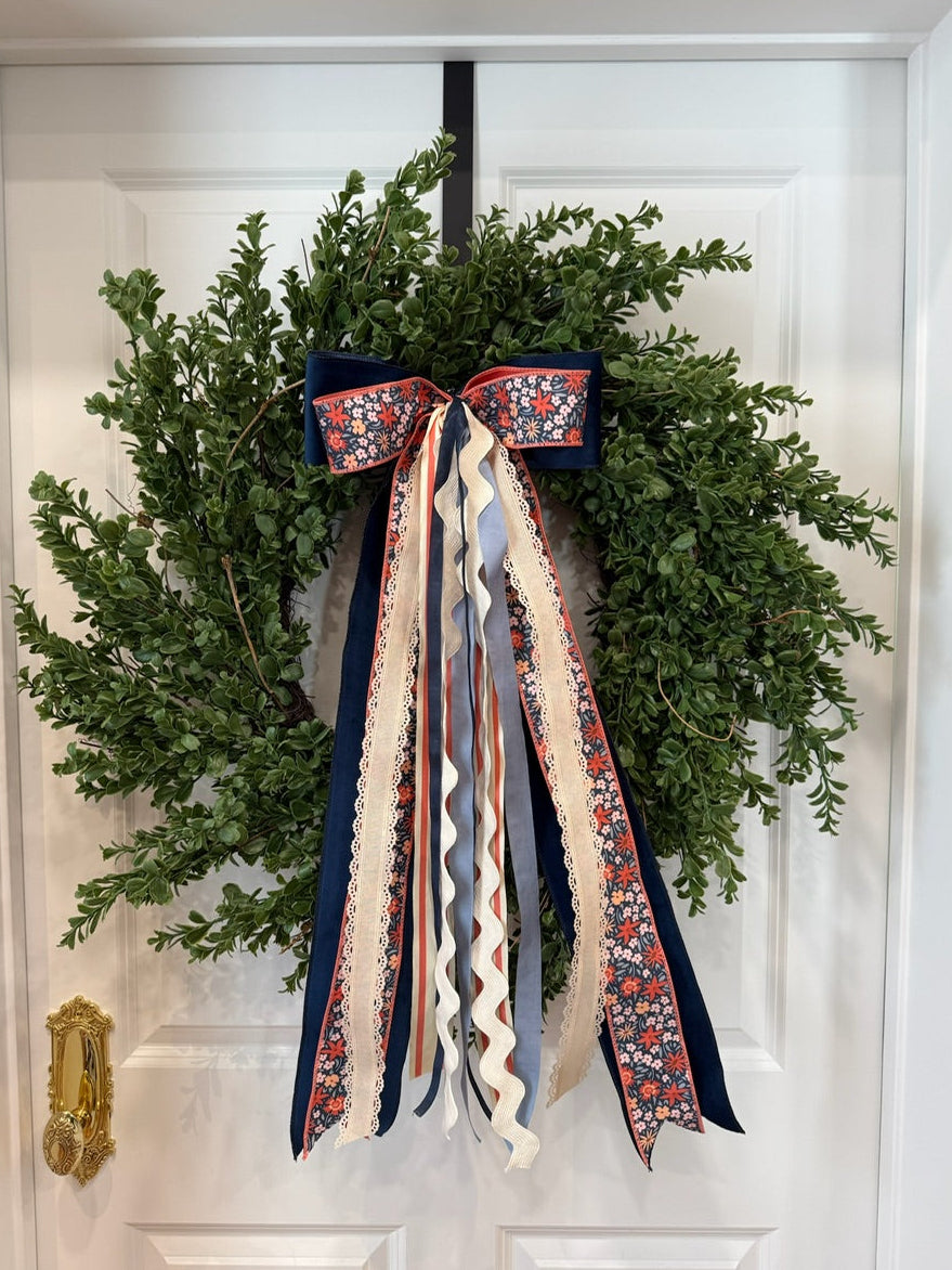 Blush & Midnight Blooms ribbon set features a navy suede bow layered under a salmon & navy floral bow, followed by perfectly coordinating ribbons in salmon and shades of blues and creams in a variety of textures and patterns. She's a beauty.