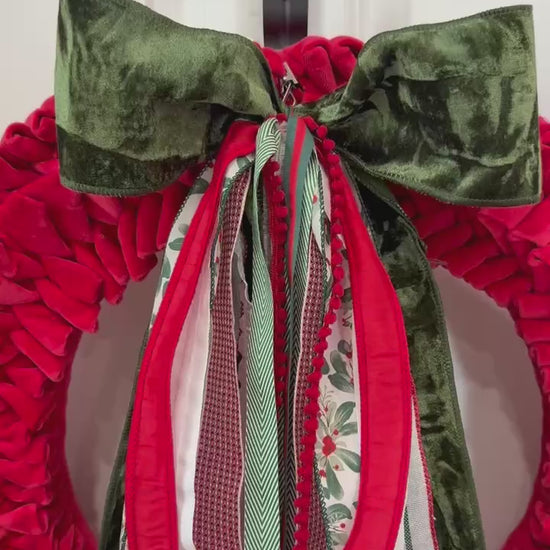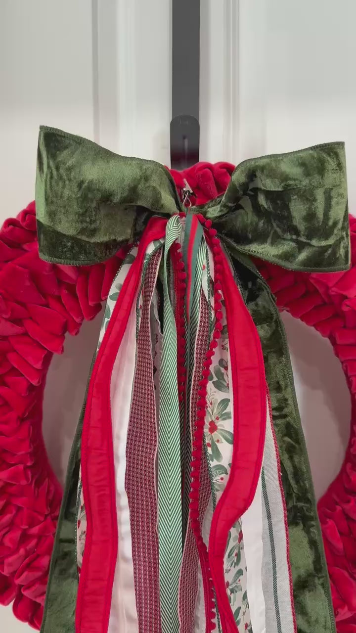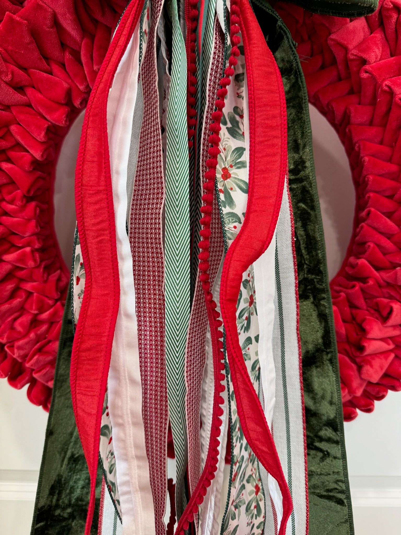 Velvet Holly & Ivy ribbon set features an incredible crushed velvet bow in deep evergreen, holly printed ribbon, white & green vertical stripe with red trimmed edge, red mini-poms, red frayed-edge grosgrain, red & white mini stripe, green & white chevron, and white satin with an accent of velvet. What a stunning holiday set!