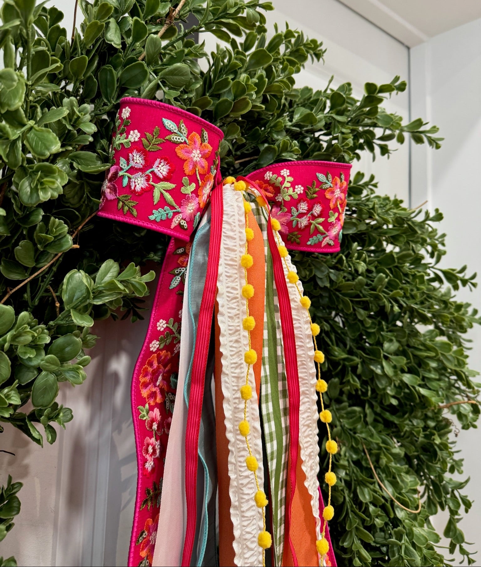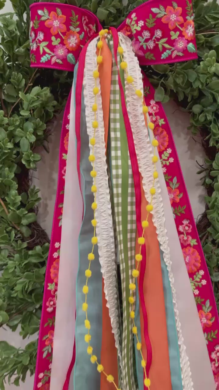 The Joy of Spring ribbon set is already a customer favorite. Beginning with a fabulous fuchsia bow embroidered with colorful flowers, and followed by bright spring colors in perfect textures and patterns, Spring Fling will make any space brighter and more happy.